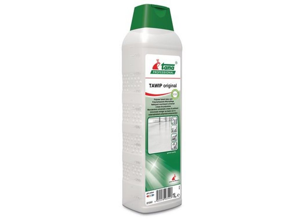 TAWIP original möjliggör rengöring och skötsel i ett steg, lämnar en väldoft och enhetligt utseende i rummet. Produkten lämnar en vårdande film som skyddar golvet från återsmutsning och lämnar ingen oönskad uppbyggnad av skikt. TAWIP original är testad enligt DIN18032. Lämplig för användning på alla golv såsom linoleum, PVC, gummi, flexplattor, natur- och konststen och förseglade trägolv. Använd inte på oförseglade trägolv. - pH-värde: 9 (koncentrat), 7.5 (brukslösning) - Dosering: Manuell rengöring: 1,25-2,5 ml / L, Spray rengöring: 40-80 ml / L - Utseende: Färglös vätska