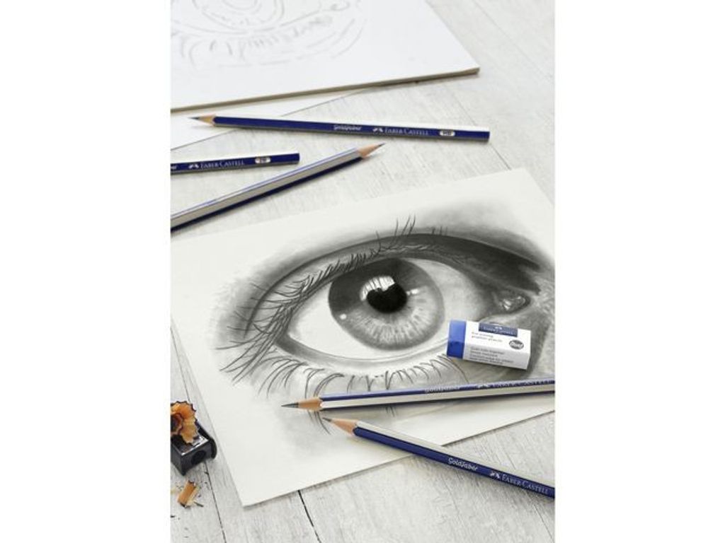 Faber-Castell Goldfaber 1221-grafitpenna består av förstklassigt bryttåligt stift av finmalen grafit och lera, vilket ger en slät och jämn applicering. Faber-Castell Goldfaber 1221-grafitpennor är perfekta för att skissa och passar så väl elever som blivande artister. Blyertsens fina yta, tillverkad av finmald grafit och lera, säkerställer en smidig och jämn applicering och enastående skissningsresultat. En innovativ SV-sammanlänkningsprocess, där blyertsen helt sammanlänkas med träet längs pennans hela längd gör blyertsen extremt brytsäkert. Den här grafitpennans sexkantiga kropp är tillverkad av hållbart trä för minimal miljöpåverkan. 1st radergummi samt 1st pennvässare ingår. - Kreativ studiografitpenna för skissning - Olika stift: 2B, 4B, 6B, B, HB, 2H - Perfekt för studenter och artister - Tillverkad finmalen grafit och lera för smidig och jämn applicering - Fullständigt sammanlänkat stift (SV-sammanlänkning) som gör att stiftet inte bryts - Miljömedveten: trä från hållbara skogar - Sexkantig pennkropp - Färg på pennkroppen: Blå, Grå
