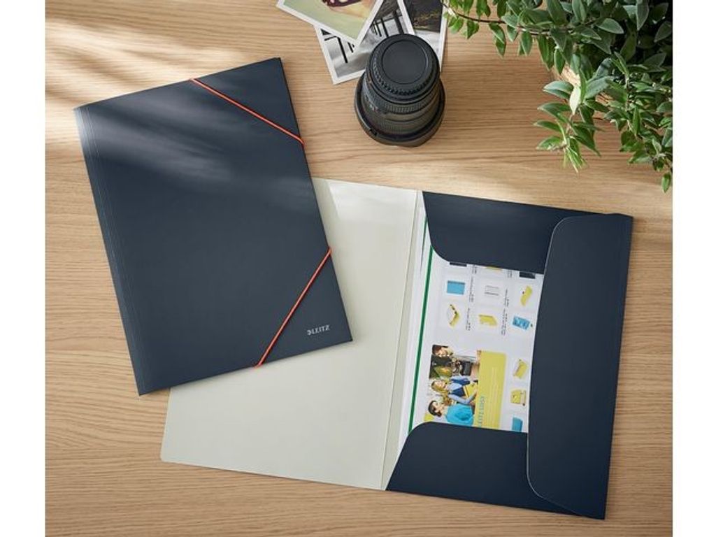 Håll dina dokument organiserade och lätta att komma åt med denna eleganta kartongmapp Cosy 3-klaffmapp med mjuk finish är perfekt för att hålla alla dina dokument organiserade när du går från möte till möte. Denna kartongmapp av högsta kvalitet är det perfekta tillskottet till ditt hem eller kontor för att hålla dig avslappnad och produktiv hela dagen. Har 3 klaffar i ovankant och sidorna för att hålla dokumenten på plats Stark elastisk snoddförslutning för att säkerställa att inga papper faller ut när du är på resande fot Färgkoda dina mappar så att du snabbt och enkelt kan hitta rätt dokument Cosy serien från Leitz kombinerar komfort och hemtrevnad med högsta kvalitet för att skapa en positiv och produktiv arbetsmiljö. - Format: A4 - Antal klaffar: 3 - Färg: Grå - Kapacitet: Upp till 150 ark A4+ - Material: Kartong 300g/m2 med mjuk laminering, syrafritt - Plastfri förpackning
