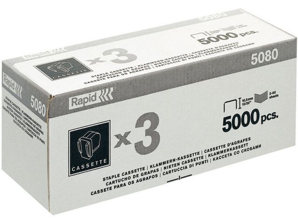 Beskrivning av Häftklammerkassett RAPID 5080 15000/fp Häftar upp till 80 ark papper (80 g/m2) Enkel laddning Patenterad häftklammerkassett Slitna delar byts ut vid varje kassettbyte