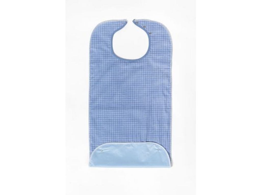 Beskrivning av Haklapp flergång spillficka blå 45x90cm Praktisk flergångshaklapp med spillficka. Tvättbar haklapp med plastad baksida och tryckknappslåsning i nacken. Knäppbar spillficka i två lägen. - Storlek: 45 x 90 cm