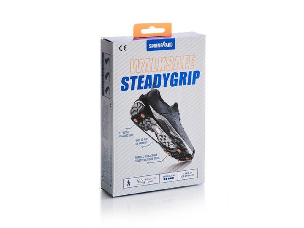 Steadygrip är ett diskret helfotsskydd som ger ett stadigt grepp på is och hala underlag. Tillverkad i tåligt naturgummi med slitstarka, utbytbara dubb i tungstenkarbid. Med sex dubbar och mönstrad undersida kan du njuta av din promenad även på vintern. Broddarna har en flexibel och nätt design som passar alla typer av skor och promenadskor. De är även enkla att dra på och av. - CE-certifierad enligt (EU) 2016/425 - Effektivt mönstrat grepp - Diskreta med god komfort - Slitstarka dubb - Storlek S: 35/38