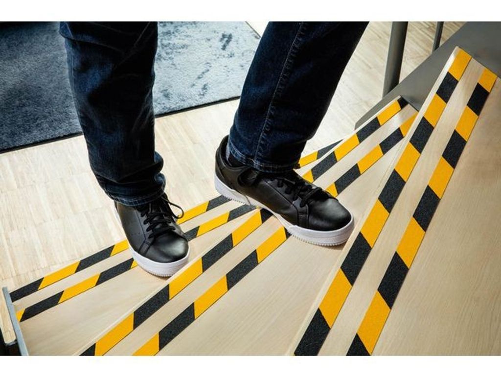 Halkskyddstejp avsedd för inomhusbruk eller i skyddade lägen utomhus där det finns en halkrisk. Halkskyddstejp avsedd för inomhusbruk eller i skyddade lägen utomhus där det finns en halkrisk. Det kan vara hala golv eller trappsteg, stegar, sluttande ramper, pedaler och stegavsatser på maskiner och fordon. Det här är en 25 mm smal, varselfärgad självhäftande tejp med medelgrov kornstorlek som ger en yta med bra grepp och friktion. Lätt att använda för vem som helst. Se till att golvet är rent och torrt. Lägsta temperatur för montering är +10, optimalt är mellan 15-20 grader. Ta bort 10 cm av den skyddande plasten på baksidan och fäst tejpen, rulla sedan ut och tag bort skyddsplasten vartefter så blir det lättare att fästa tejpen i önskad linje. Efter 48 timmar har klistret härdat helt, men det går att gå på tejpen direkt efter monteringen. - Halkskyddsgrad R13 i enlighet med DIN51130 - Rulle om 15 meter - Bredd: 25 mm - Kornstorlek: 60 grit