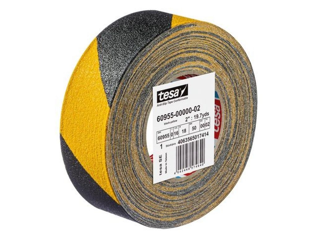 tesa 60955 är en halkskyddstejp med en formbar bärare som är utvecklad för att fästa mot golvbrädor och andra oregelbundna ytor där det krävs ett bra grepp och ett säkert fotfäste. Formbar, enkelsidig halkskyddstejp med ett skyddspapper av PET. Den består av en formbar, halksäker bärare som kan rivas av för hand samt ett häftämne av akryl. Bäraren består av aluminium belagd med mineralkorn och är särskilt utvecklad för att anpassa sig till kanter och fästa på ojämna ytor. Funkar på golvplattor, stegar, lastramper, plana ytor med t.ex. skruvhuvuden eller nitar. - Mått: 50mm x 18m - Färg: gul/svart