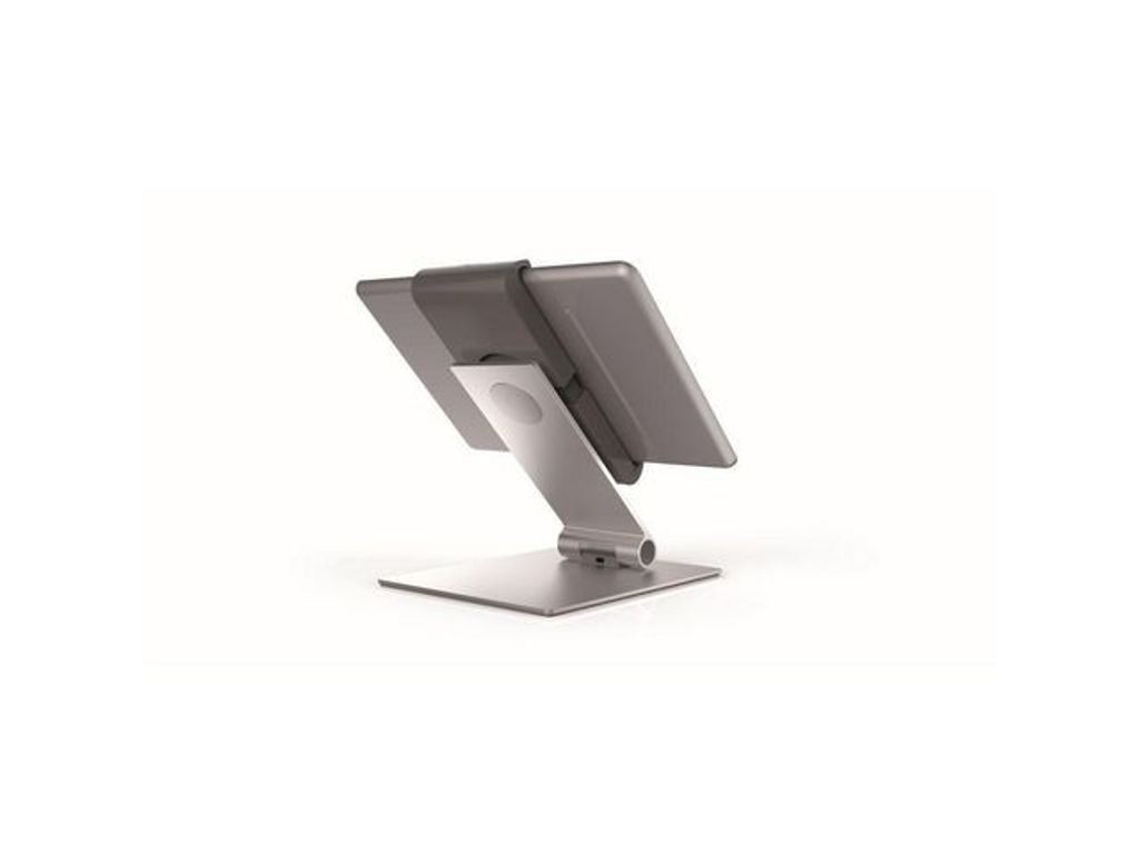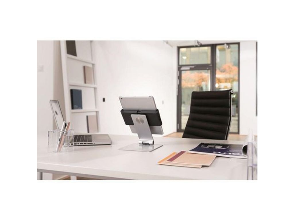 Surfplattehållare i en snygg och funktionell design för surfplattor i storlek 7'-13' (160- 275 mm). Surfplattehållare i en snygg och funktionell design för surfplattor i storlek 7'-13' (160- 275 mm). För informationsdelning och presentationer i butiker, receptioner, försäljnings- och utställningslokaler. Stabilt och stadigt bordsstativ som är steglöst vinklingsbart från 0° till 88°. Hållaren, med gummibelagda ytor som skyddar surfplattan från repor och skador, kan vridas 360° med fyra stopplägen vid varje 90°, för användning i stående eller liggande format. Surfplattan är enkel att sätta i och ta ur hållaren, som låses med en särskild nyckel för att förhindra stöld. Dessutom går hela bordsstativet att låsa fast med ett externt kabellås 'Minisaver mobile lock' från Kensington. Laddningskabeln ansluts genom en öppning i hållaren. - Maxvikt för surfplattan: 1 kg. - Material: plåt, aluminium, ABS-plast - Mått: B 155 x H 242 x D 183 mm