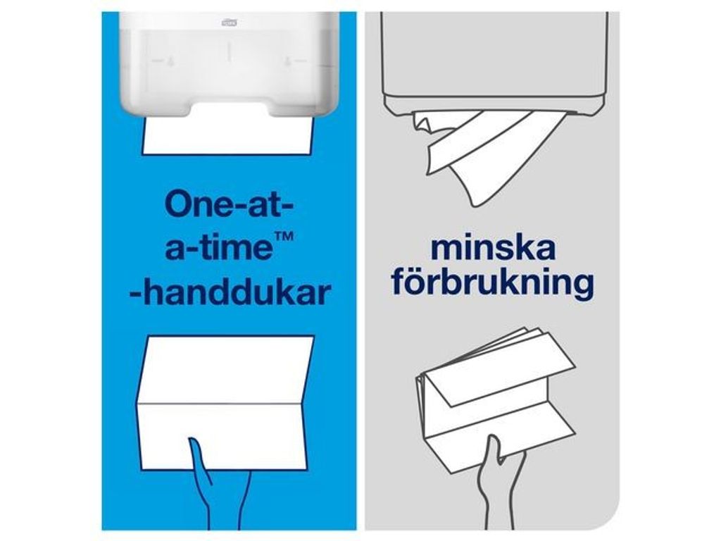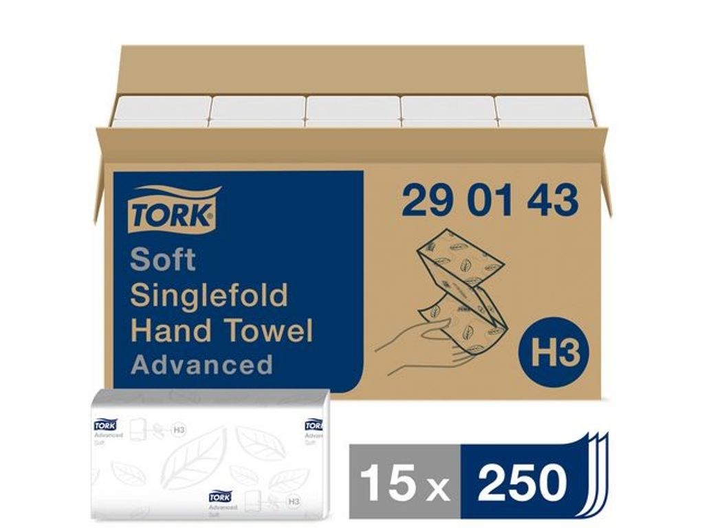 Pappershanddukar i Advanced-kvalitet för effektiv torkning. Förbättra hygienen och minska avfallet i toalettutrymmen med medelhög besöksfrekvens med Tork Singlefold Pappershanddukar. Den mindre storleken är prisvärd samtidigt som den höga absorptionsförmågan och mjukheten ger en effektiv handtorkning. Underhållsarbetet för personalen förenklas dessutom tack vare Tork Easy Handling förpackningen. I kombination med en Tork Singlefold handduksdispenser matas pappers-handdukarna ut en i taget, vilket minskar förbrukningen. Dispensersystemet passar även i begränsade utrymmen för maximal mångsidighet. Kompatibel med Tork H3 dispensrar. - 2-lagers, vit - Advanced-kvalitet - System: C-fold och Singlefold, H3 - 1 bunt per förpackning. med 250 dukar vardera - Vikt storlek: D 11.5cm, B 22.6cm - Ovikt storlek: D 23cm, B 22.6cm - Dekorativ Tork logotyp och lövdekor - Tork Easy Handling förpackning - Certifierad för kortvarig kontakt med livsmedel - Material: 100% återvunna fiber - FSC-märkt - EU Ecolabel: licensnummer SE/004/001
