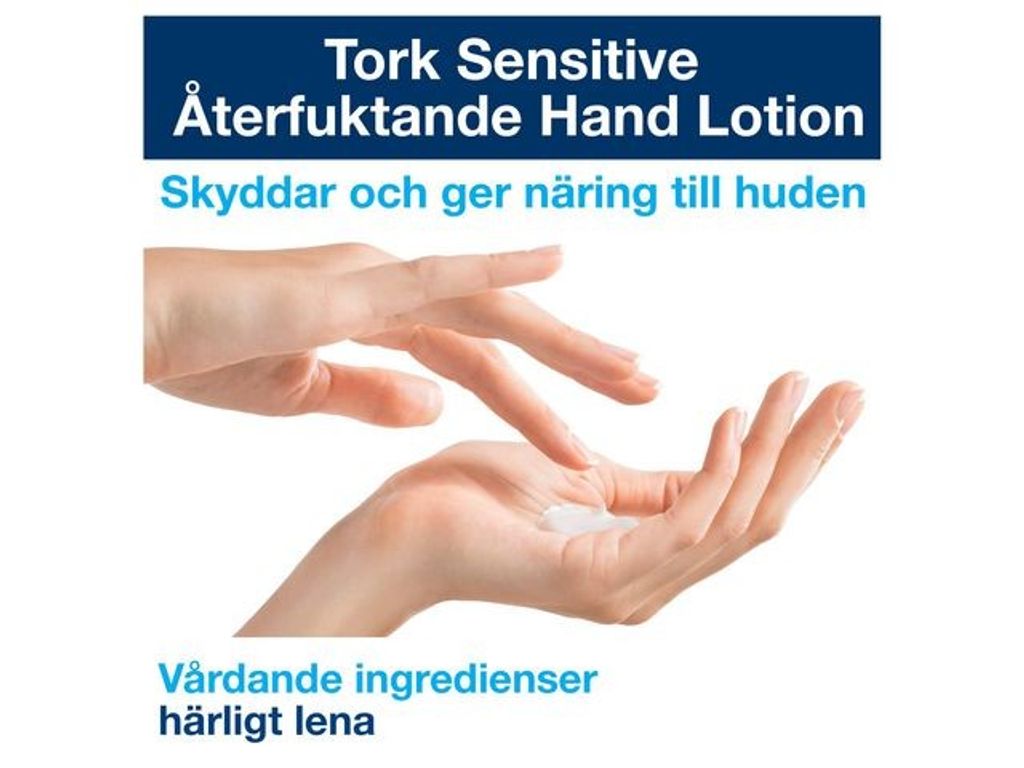 Oparfymerad handlotion som gör dina händer lena och mjuka varje dag. Tork Sensitive Återfuktande Hand Lotion är idealisk för torr hud, då den lämnar huden med en närande och mjuk känsla. Det är en oparfymerad lotion med vårdande ingredienser som hjälper till att bibehålla hudens fuktbalans. Denna formula passar med Tork Dispenser Flytande Tvål Mini som är certifierad easy to use och förser alla användare med god handhygien. - Idealisk för torr hud - Fuktgivande ingredienser som gör huden mjuk - Snabbabsorberande för en kladdfri känsla - Hygienisk, fabriksförseglad flaska med ny pump för varje refill - Flaska som krymper ihop för 70% minskad avfallsvolym (baserat på test av Essity) - System: Tork S2 - Lukt: Parfymfri - Utseende: Vit - Svanen: Licensnummer 20900085