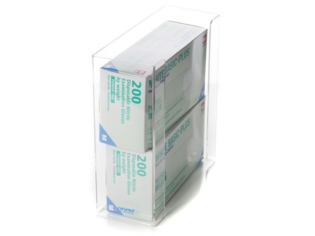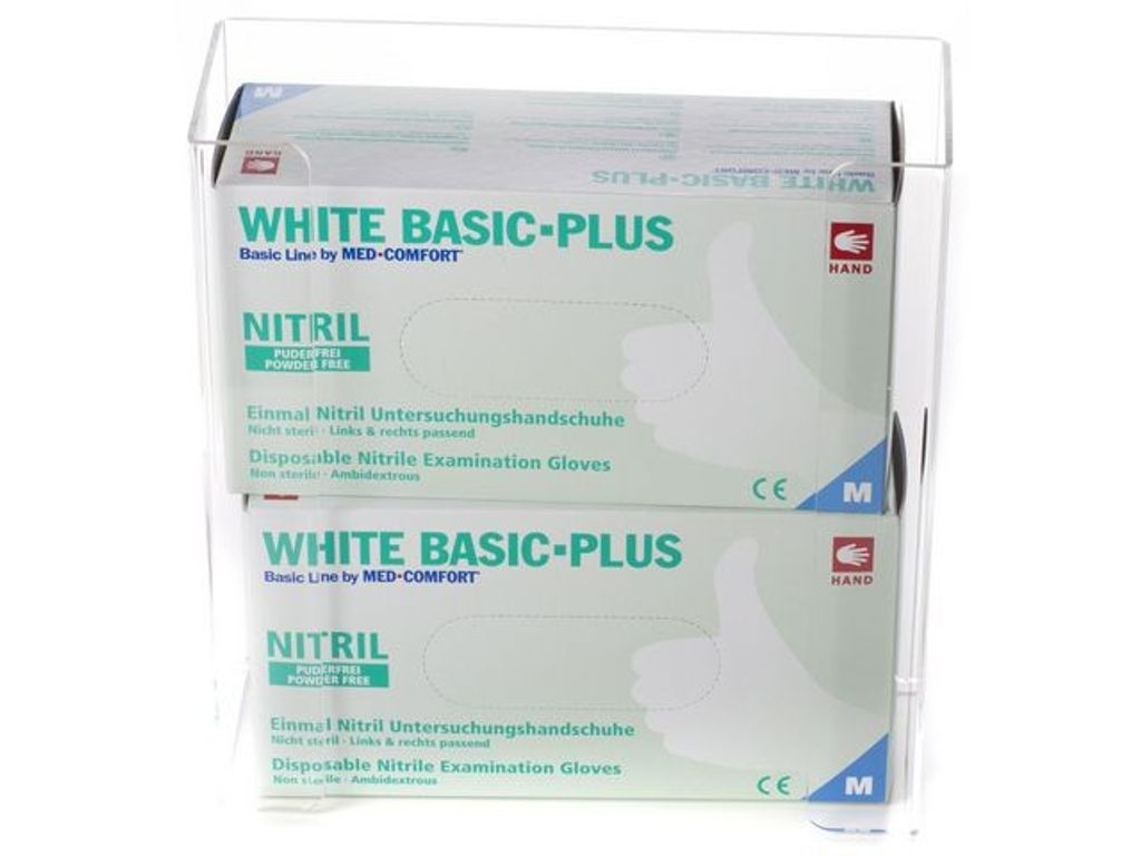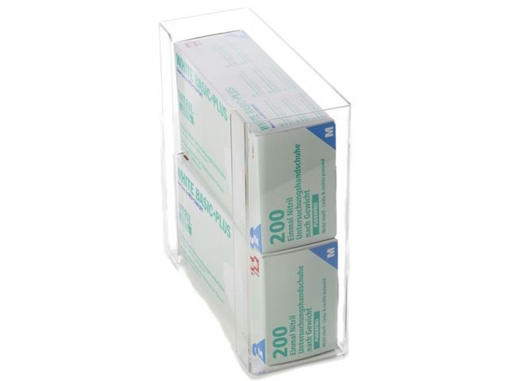 Handskhållare för engångshandskar, av högsta kvalitet. Handskhållare för engångshandskar är tillverkad av heltransparent plexiglas av högsta kvalitet. Det är en stilren design gjord för väggmontering. Med ett enhandsgrepp garanterar den användaren en snabb och enkel tillgång till nya handskar. Rymmer två askar. Bredd: 27,5 cm Höjd: 28,5 cm Djup: 10,5 cm Vikt: 0,4 kg