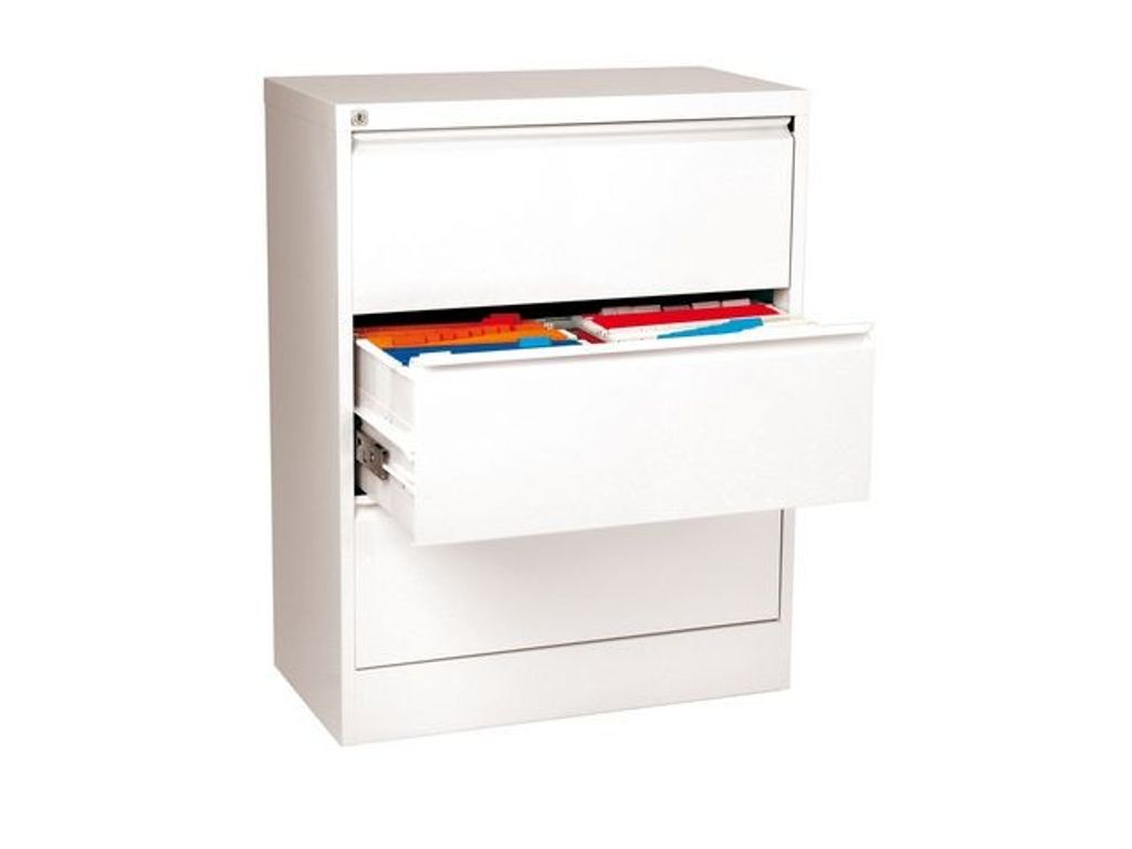 Flanköppnat hängmappsskåp med 3 lådor tillverkat av 1 mm pulverlackad vit stålplåt. Rymmer ca 90 hängmappar per låda. - Centrallåsning - 2 nycklar ingår - Tillverkade av 1 mm vit pulverlackerad stålplåt - Vippspärr för extra säkerhet, bara en låda går att dra ut åt gången - Löstagbara lådor - Kapacitet: Cirka 270 mappar - Mått: 80,2 x 103,2 x 42,5 cm (BxHxD)