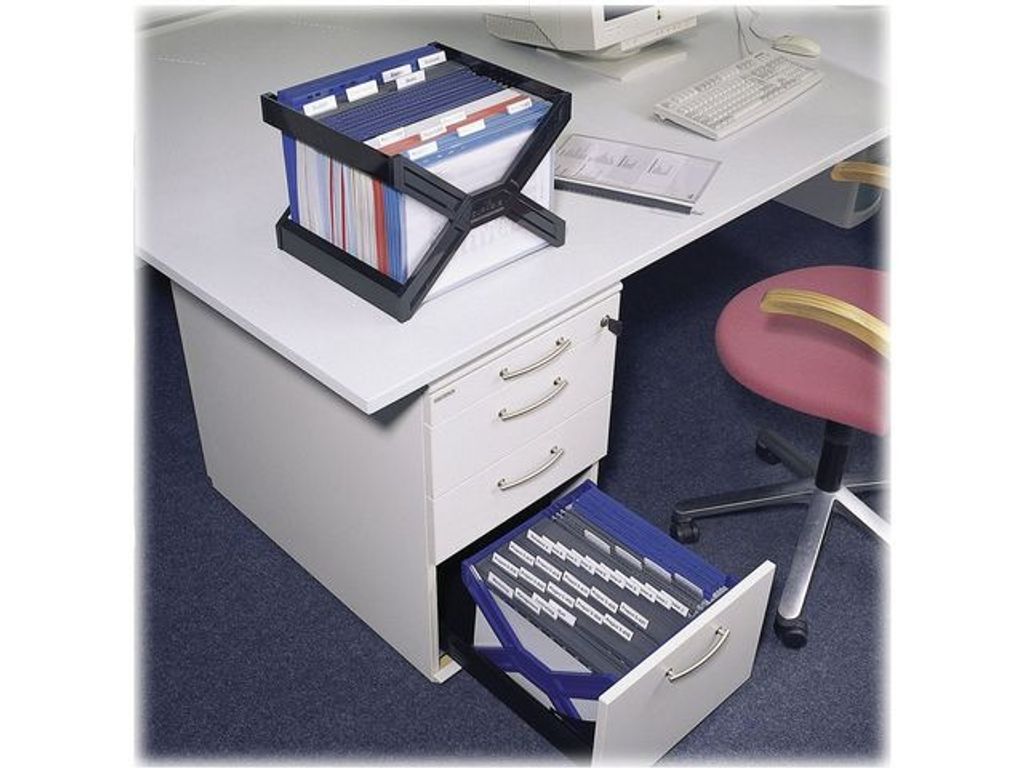 Robust och stabilt hängmappsställ av polystyrenplast som framställts av min. 80 % återvunnet material. Rymmer ca 30 st. hängmappar för dokument i A4-format och passar i de flesta skrivbordslådor. Kan vikas platt när det är tomt. Stapelbart. Produkten är Der Blaue Engel-certifierad för sin miljöprofil. - Mått: BxHxD 27 x 36 x 32 cm
