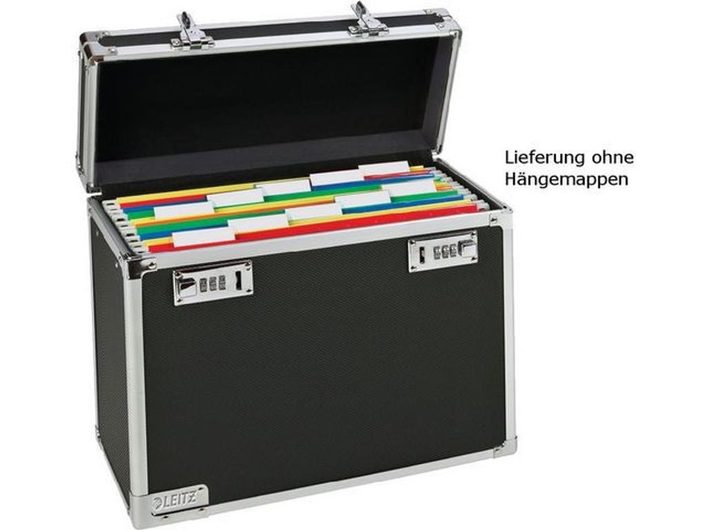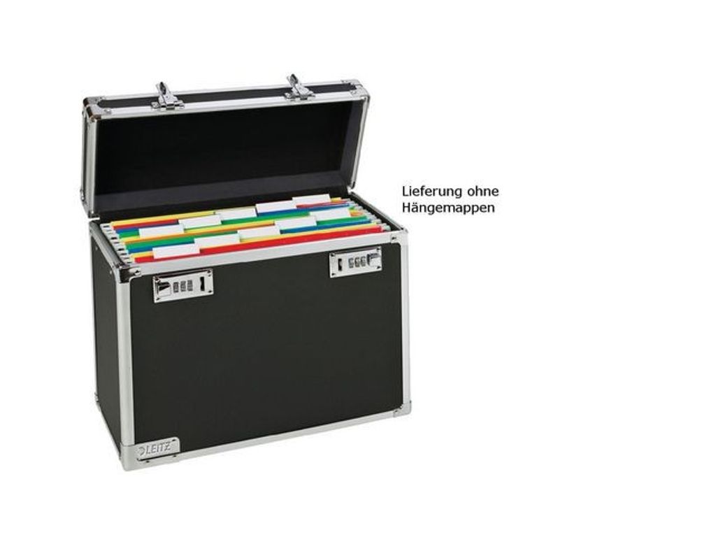 Beskrivning av Hängmappsväska Portabel Säkerhet och sekretess i bårbar Leitz-hängmappslåda med dubbla kombinationslås Dubbla kombinationslås för extra säkerhet Namnkortshållare Bärhandtag Mått (BxDxH): 330x155x275mm Rymmer 15 mappar