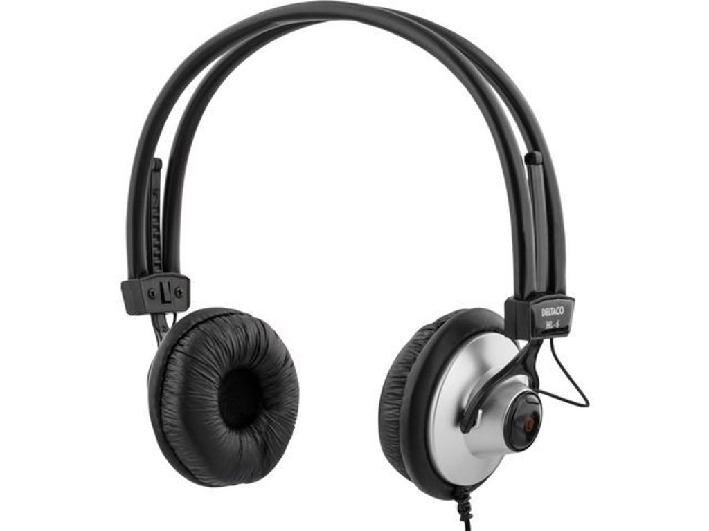 Beskrivning av Hörlur DELTACO kåpor grå/svart Hörlur med volymkontroll, 2,2m kabel, svart/silver. Hörlur med utanpåliggande stoppade kåpor och ställbar bygel. - Volymkontroll på kabeln - Justerbar huvudbygel - Material: PA -
