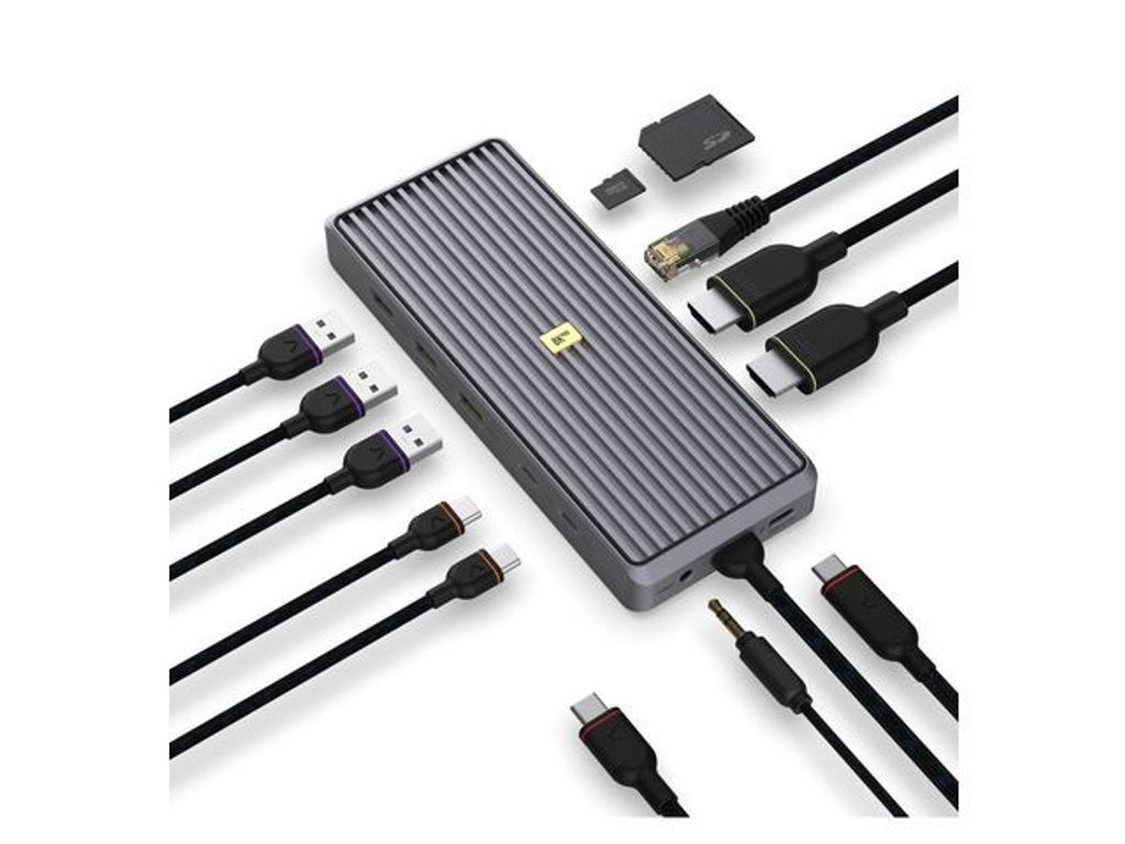 Högkvalitativ USB-hub med aluminium-chassi, hög upplösning och snabb dataöverföring. - Anslutning: 2x HDMI 4K (1x 8K), 1x USB-A 3.2 Gen 2, 2x USB-A 3.2 Gen 1, 2x USB-C 3.2 Gen 2, 1x USB-C PD 100W, 1x Network, 1x SD-Card, 1x MicroSD, 1x Audio 3.5 mm - Räfflad aluminium för överlägsen värmereglering - Tidlös design av kvalitativa material - Förstärkt kabel för extra hållbarhet - Stödjer följande protokoll: Thunderbolt 3&4, USB-C med Alt DP för Video, HDCP 2.3, MAC pass-through, PowerDelivery 3.0 och Universal Use -