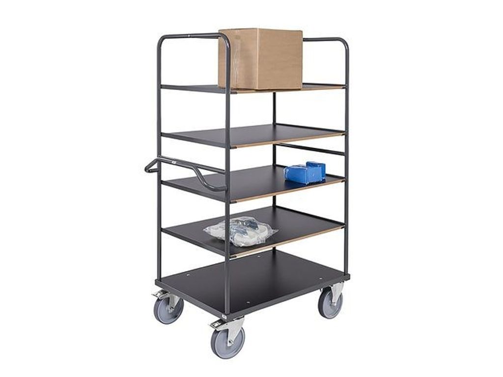 En optimerad hyllvagn både gällande ergonomi och estetik. Vagn från serie 300 utrustad med ergonomiska handtag, bromsade hjul och lackad i en stilren grå färg. - Belastning: 500kg - Storlek: 1100 x 700 x 1800mm (LxBxH) - Färg: Mörkgrå/svart - Vagnens vikt: 72kg - Bromsade hjul: Ja - Hjultyp: 2 fasta, 2 länkhjul med broms
