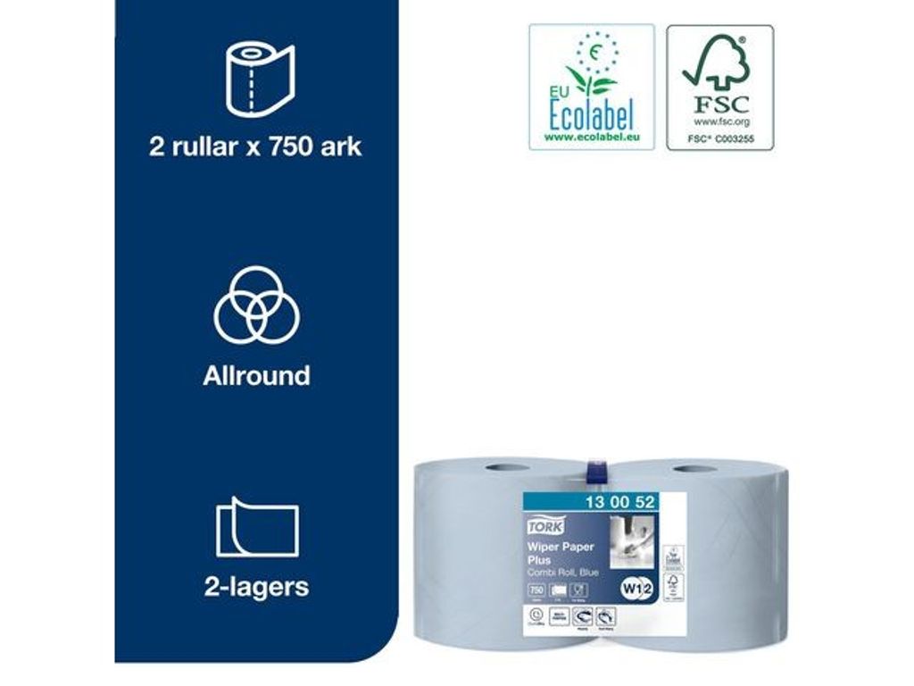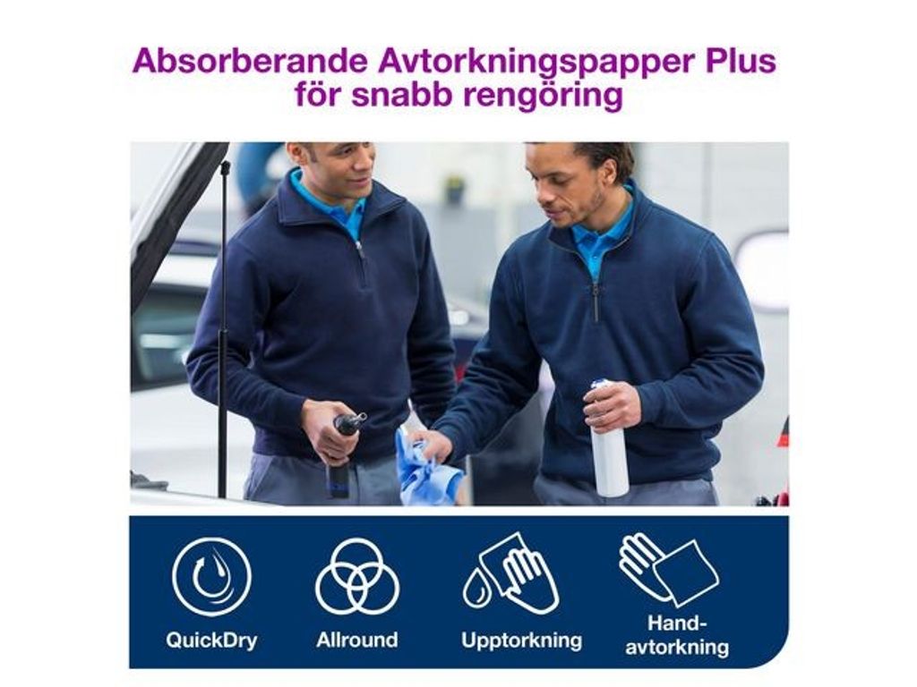 Stark allround-kvalitet, perfekt för avtorkning av händer och lätt smutsade ytor. På hektiska arbetsplatser behöver personalen snabbt och effektivt kunna ta hand om spill. Tork Avtorkningspapper Plus är den perfekta allround-lösningen för att torka upp vätskor och hålla händerna rena. Perfekt för att torka, suga upp oljespill. QuickDry-teknologi gör pappret mer absorberande än vanligt avtorkningspapper och ser till att uppgifter kan lösas effektivt och med mindre avfall. Tork Easy Handling plastförpackning gör det enkelt att bära och göra sig av med förpackningen. Kompatibel med Tork W2, W1 dispensrar. - 2 rullar med 750 ark vardera - 2-lagers, blå - Premium-kvalitet - System: Vägg- och Golvställ W1, W2 - Rullstorlek: L 255m x B 23,5cm - Arkets längd: 34cm - Hylsa inre diameter: 7,1cm - Material: återvunna fiber och nyfiber - FSC-märkt - EU Ecolabel: licensnummer SE/004/001