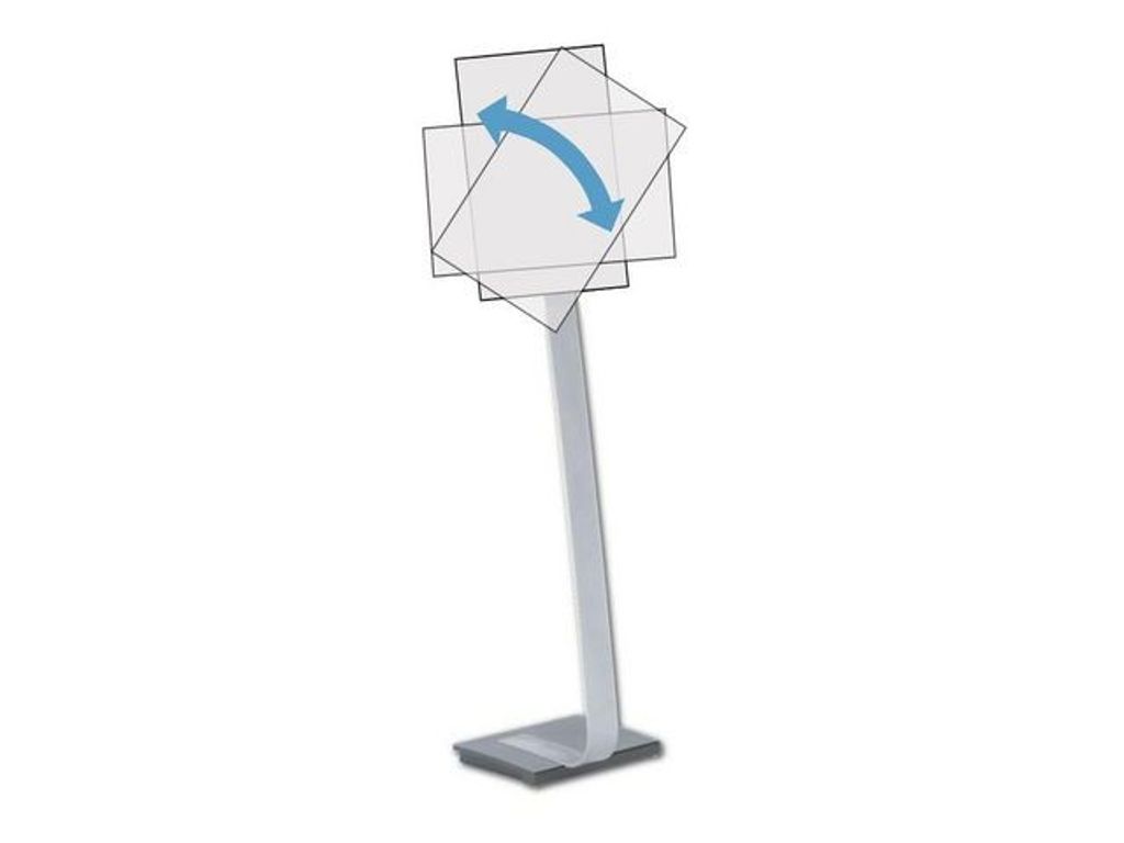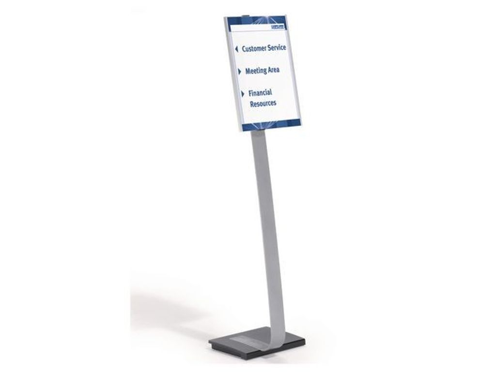 Skyltställ med stor skylt som syns på långt håll, för användning i bl a receptioner, restauranger och utställningar. Golvstället är av aluminium och har en tung järnfot med gummifötter som gör att stället står stadigt. Skylten i A3-format är vridbar så att den kan användas i stående eller liggande format. Arket med information är skyddat under en plexiglasskiva som lätt tas bort när informationen ska bytas ut. I gratisprogrammet www.duraprint.eu finns det mallar för att designa skylten. - Skylten kan placeras i sex fasta steg så att den färdigmonterade höjden för skyltstället med skylt i stående format är mellan 1.18 m - 1.25 m . Liggande är totalhöjden mellan 1.13 - 1.20 m. - Levereras i platt paket med monteringsanvisning.