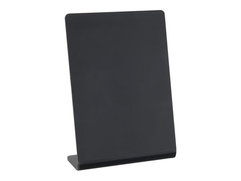 Beskrivning av Informationsställ griffel lutande A6 sva Griffelställ A6 i akryl med en sida mattsvart för skrift med kalkpennor. Obs använd ej kritor då dessa repar plasten. - Format: A6 - Ensidig lutande