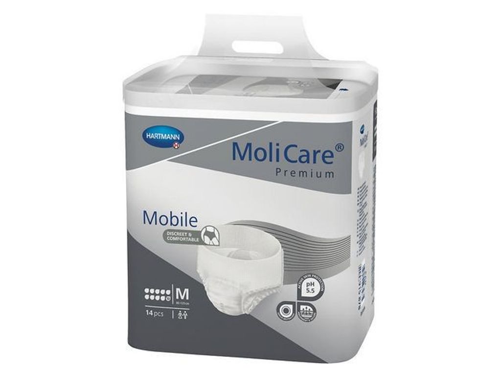 MoliCare Premium Mobile engångsbyxor ser ut som vanliga underkläder tack vare dess anatomiska form, mjuka material och höga elastik, vilket också ger en kroppsnära passform och hög diskretion. Ytskiktet av Curly fiber närmast huden ger en antibakteriell och pH 5,5-neutral effekt för optimal hudhälsa. MoliCare Premium Mobile är dermatologiskt testad. Den absorberande kärnan neutraliserar lukt, absorberar snabbt och håller huden torr. Byxan ger maximalt läckageskydd genom en tre-lagers absorptionskärna och ett tvådelat sidobarriärsystem som ger säkert skydd mot sidoläckage. Rivbara sidosömmar gör skyddet enkelt att ta av. Färgens tråd i midjan indikerar storlek och absorptionskapacitet. - MoliCare Premium Mobile 10 Droppar är en högabsorberande byxa som uppfyller de högsta kraven vid mycket stor inkontinens. Den är särskilt lämplig för användning på natten - Storlek: Medium