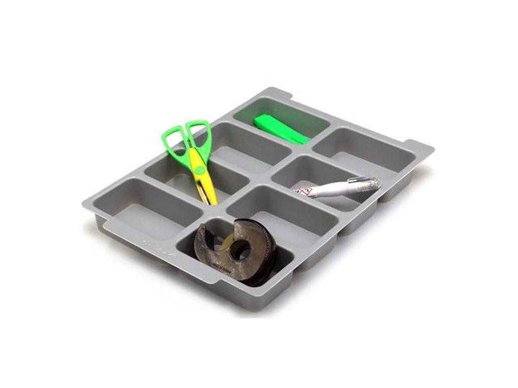 Beskrivning av Insatslåda 8 sektioner För detaljerad förvaring. Passar till dom låga backarna. Av grå polystyrenplast.