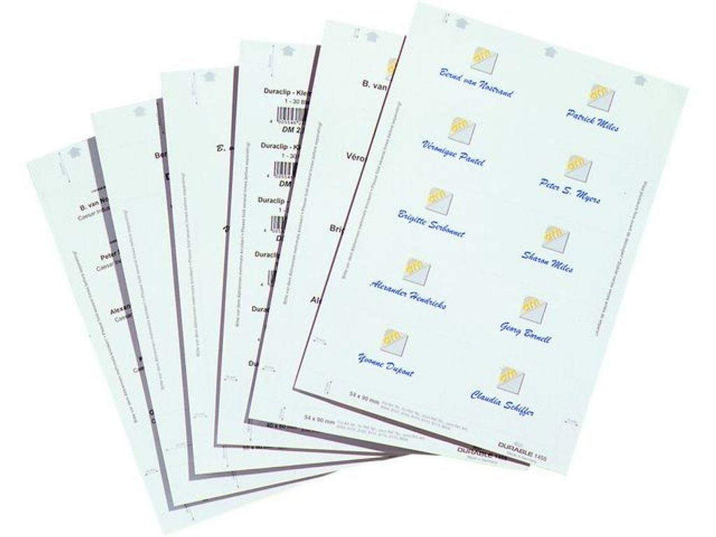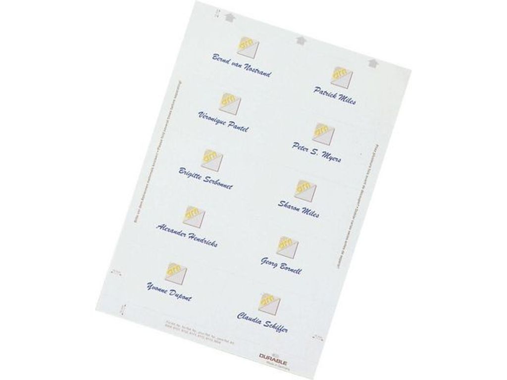 Insticksetiketter på A4-ark för utskrift i laser- eller inkjet skrivare. Lätt att dela etiketterna med microperforering. Programvara finns att ladda ner som hjälper dig att skriva ut personligt designade skyltar på www.durable.se. Insticksetikett 150x61mm (BxH). 150 grams papper. 2 etiketter per ark, 20 ark per förpackning. Dubbelsidiga.