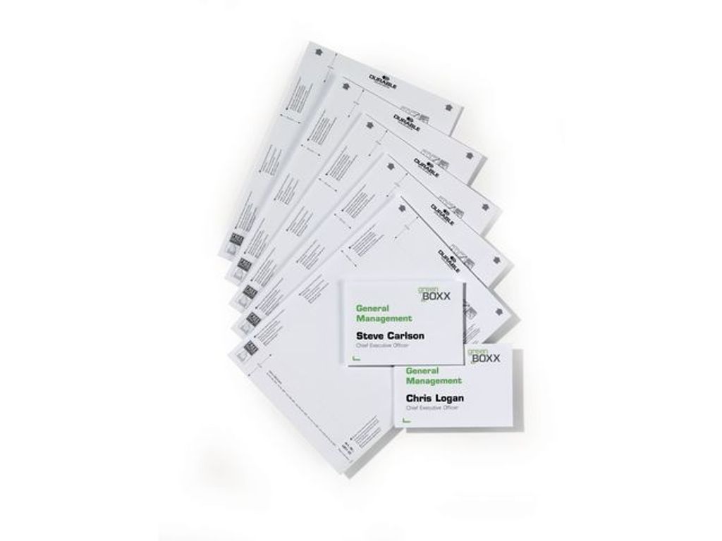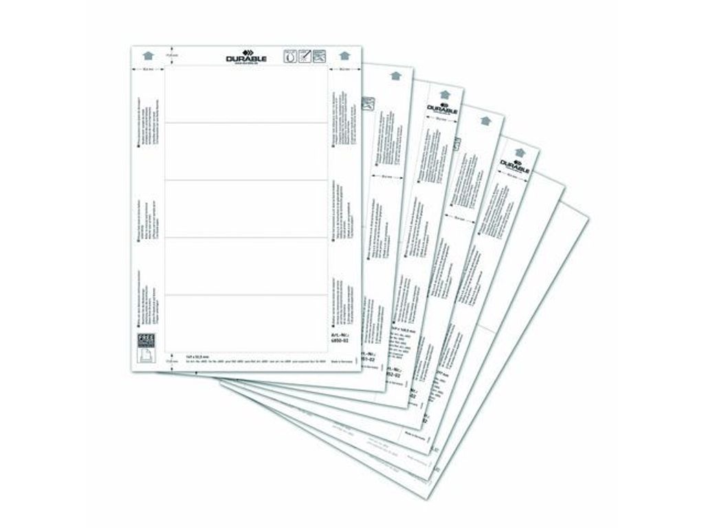 Vita 160 gr A4 ark som passar till skyltarna skyltarna INFO SIGN 4801 och CLICK SIGN 4861, liggande A6 format 149x105,5mm. Designaskylten med hjälp av gratisprogrammet DURAPRINT® som finns på www.duraprint.se och skriv ut med laserskrivare. En förpackninginnehåller 10 ark med 2 skyltinstick/ark. Arken är perforerade och lätta att riva isär.
