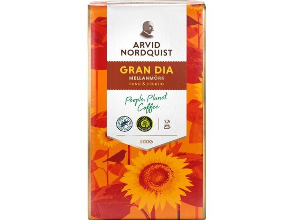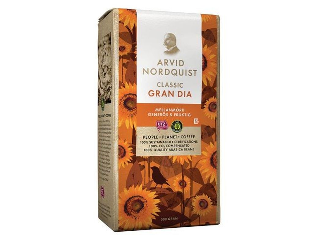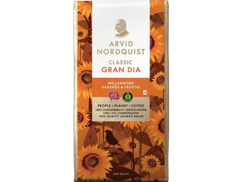 Arvid Nordquist Gran Dia är ett mellanmörkt kaffe med nötiga toner och en behaglig beska. Kaffet har en doft med inslag av knäck. Eftersmaken är generös och rund. Mellanmörkt kaffe gjort på 100% Arabicabönor. Arvid Nordquist Gran Dia är ett mellanmörkt kaffe med nötiga toner ocvh en behaglig beska. Kaffet har en doft med inslag av knäck. Eftersmaken är generös och rund. Bönorna är 100% Arabicabönor och kommer från Brasilien, Centralamerika, Colombia och Östafrika. Arvid Nordqvist Gran Dia är 100% hållbart certifierat (UTZ certifed) och 100% klimatkompenserat. - Mellanmörkt - 100 % Arabicabönor - Vikt: 500 gram