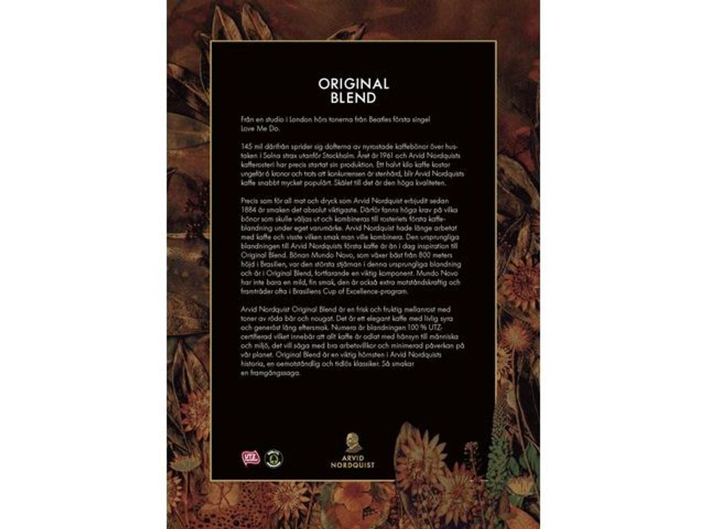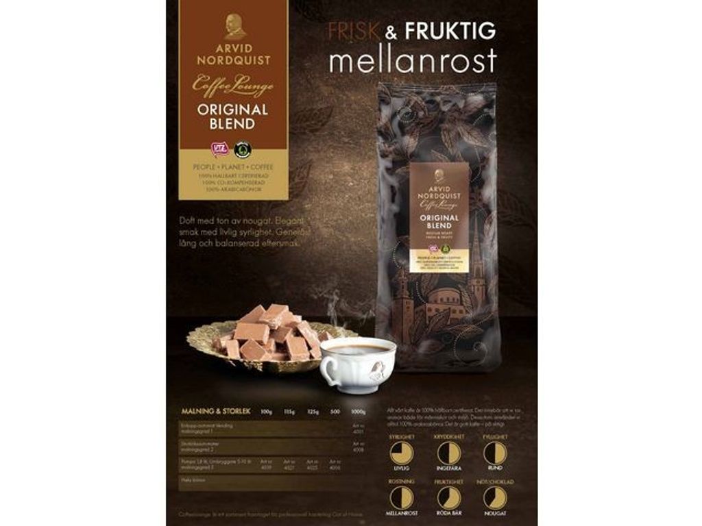 Kaffe ORIGINAL BLEND mellanrost 500g från Arvid Nordquist är ett automatkaffe av hög kvalitet! Smaken är frisk och fruktig med toner av nougat och en lätt arom av mörk choklad. Arvid Nordquist Original Blend är en elegant smakupplevelse med livlig syrlighet. Eftersmaken är balanerad och generöst lång. Original Blend mellanrost är malet på 100% certifierade Arabicabönor från Brasilien, Centralamerika, Colombia och Östafrika. Njut av ett mellanrostat kaffe från Arvid Norqquist av högsta kvalitet. - Mellanrostat kaffe - Frisk och fruktig smak - Inslag av nougat och mörk choklad - Livlig syrlighet - Balanserad och lång eftersmak - 100% certifierade Arabicabönor från Brasilien, Centralamerika, Colombia och Östafrika