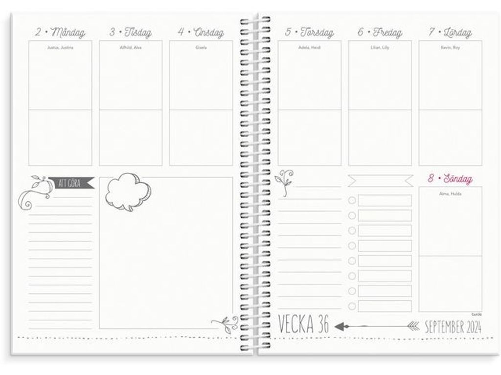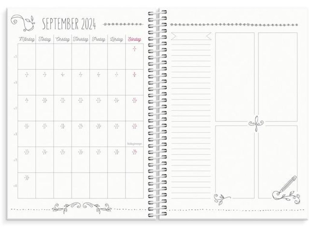Låt din planering bli en kreativ och avkopplande paus! Det blir inspirerande att planera med din Doodle. Kalendern inleds med ett ark snygga stickers som du kan dekorera med efter känsla. Varje uppslag är lekfullt utformat och lämnar stort utrymme för dig att fylla med inspirerande färger, illustrationer och uppgifter. - Format: A5. - Layout: Stående. Vecka/Uppslag. - Kalendarium: 2025-06-03 - 2025-07-06. - Omslag: Kartong med sammetslen yta. Spiralbunden. - Detaljer: Gummiband. Flyttbar linjal. Pappersficka. - Innehåll: Årsplaner, stickersark. - Antal sidor: 160. - Miljöinformation: FSC®.