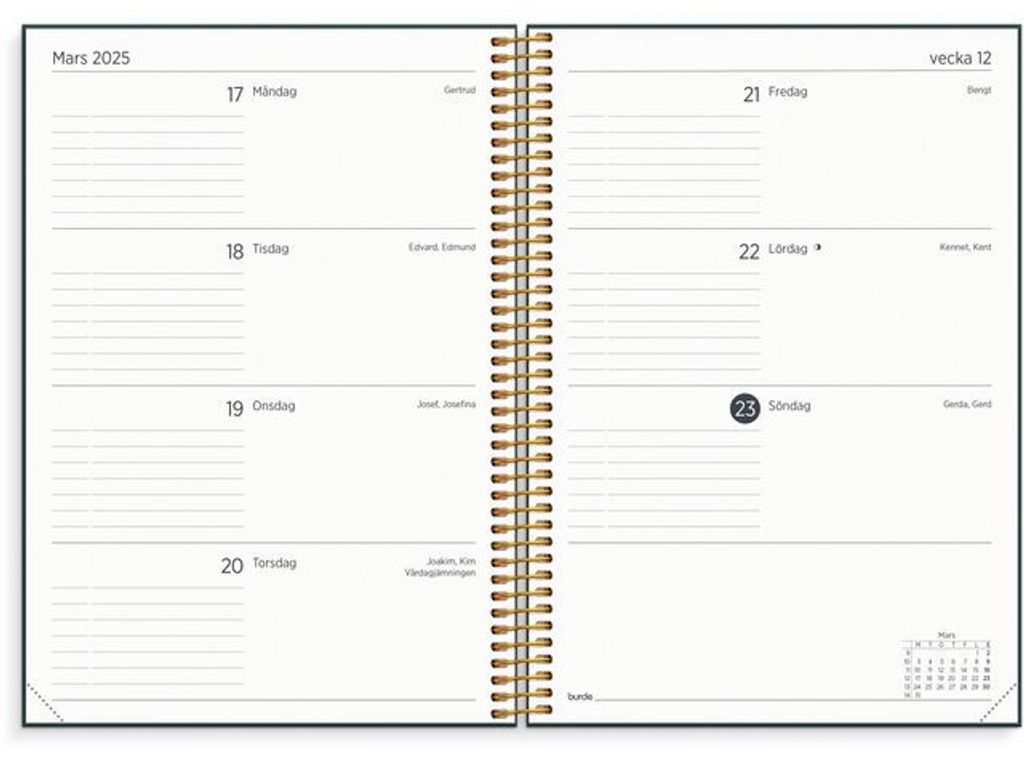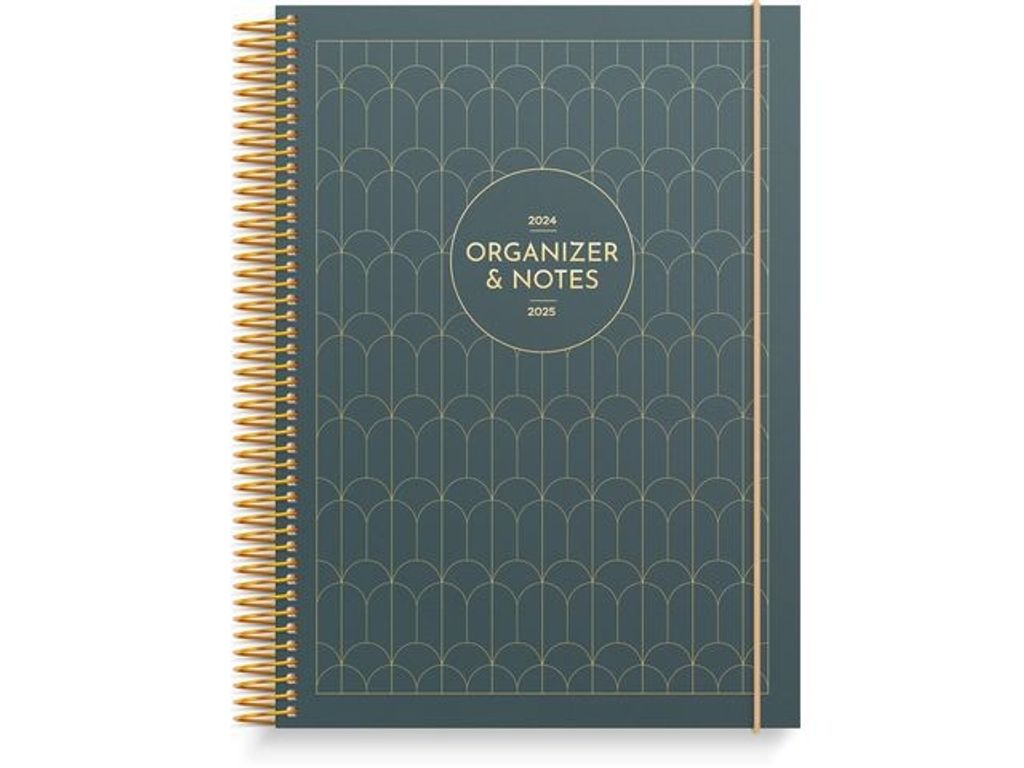 En kalender och anteckningsbok i ett! Med Organizer and Notes får du gott om utrymme att planera varje dag. Första halvan innehåller kalendarium och andra halvan innehåller linjerade sidor för dina listor och anteckningar. Med hjälp av de flyttbara flikarna förflyttar du dig snabbt och smidigt mellan veckoplanering och anteckningar. När du har allt på samma ställe minskar stressen och du kan lägga fokus på annat. - Format: A5. - Layout: Liggande. Vecka/Uppslag. - Kalendarium: 2024-06-03 - 2025-07-13. - Omslag: Kartong med struktur. Spiralbunden. - Detaljer: Gummiband. Flyttbara markörer. - Innehåll: Årsöversikter, årsplaner, anteckningssidor. - Antal sidor: 256. - Miljöinformation: FSC.
