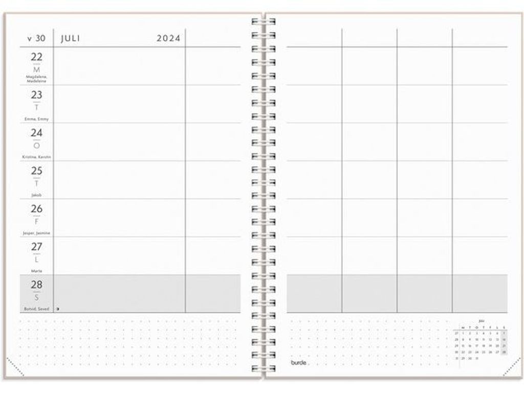Behöver du hålla koll på fler än dig själv eller kanske olika projekt? Då är veckoplaneraren Plan more den perfekta hjälpredan. I den här kalendern finns 5 extra kolumner för varje dag och du kan smidigt få en överblick över alla aktiviteter, möten och planer. - Format: A5. - Layout: Stående. Vecka/Uppslag. - Kalendarium: 2024-07-01 - 2025-07-27. - Omslag: Kartong med struktur. Spiralbunden. - Detaljer: Gummiband. Pappersficka. - Innehåll: Årsplaner. - Antal sidor: 160. - Miljöinformation: FSC®.