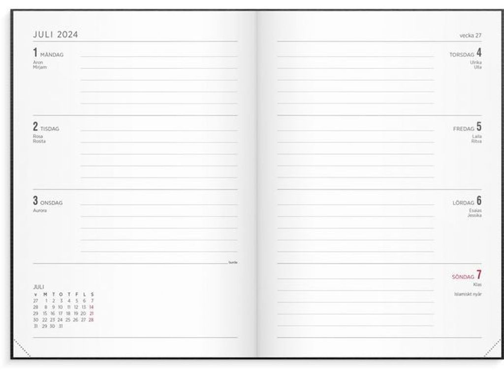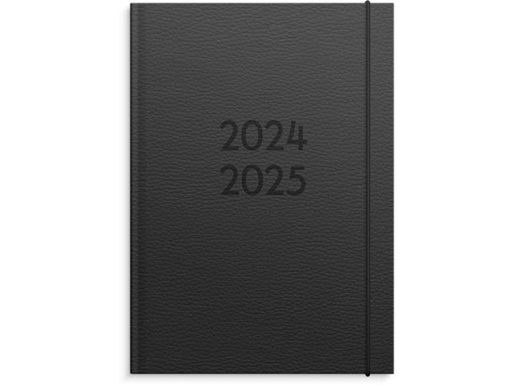 En stilren och klassisk kalender. Kalendern har ett uppslag med liggande layout där fokus ligger på tydlig veckoplanering. Inlagans layout passar dig som har mycket på gång, oavsett veckodag. Kalendern är enkel och tydlig med lika mycket utrymme för både vardag och helg. - Format: A5. - Layout: Liggande. Vecka/Uppslag. - Kalendarium: 2024-06-03 - 2025-07-06. - Omslag: Kartong med struktur. Inbunden. - Detaljer: Gummiband. Märkband. - Innehåll: Årsöversikter, årsplaner. - Miljöinformation: FSC®.