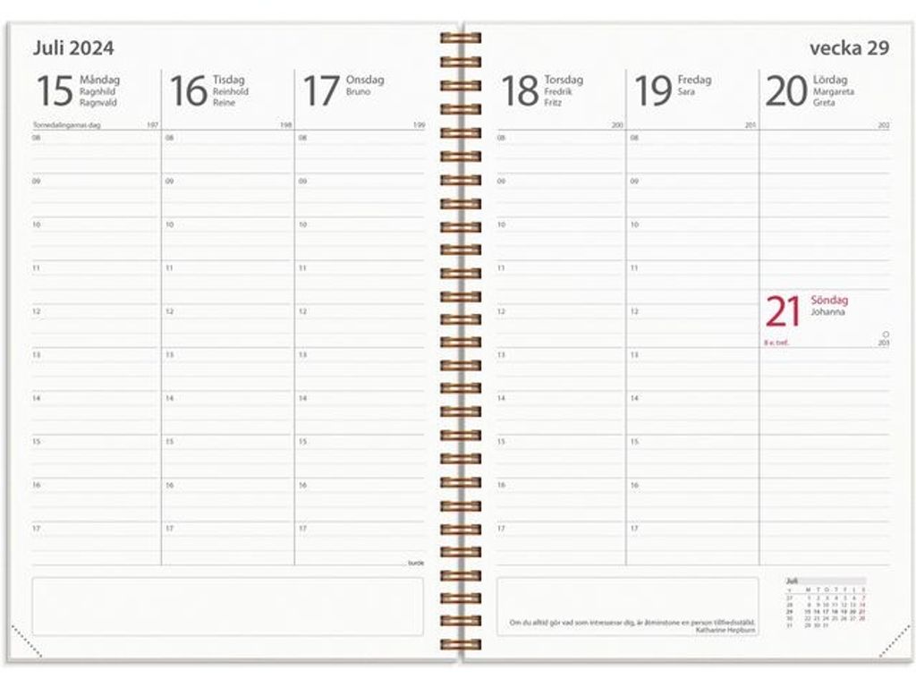 Vackert blom- och fjärilsmotiv i varma fina färger. Inlagan är en tydlig kalender med stående layout och timindelning 8-17, som hjälper dig att behålla strukturen genom hela läsåret. Kalendern har även en praktisk förvaringsficka och tänkvärda citat. - Format: A5. - Layout: Stående. Vecka/Uppslag. - Kalendarium: 2024-06-03 - 2025-08-31. - Omslag: Kartong med struktur. Spiralbunden. - Detaljer: Gummiband. Pappersficka. - Innehåll: Årsplaner, schema, provresultat. - Antal sidor: 176. - Miljöinformation: FSC®.