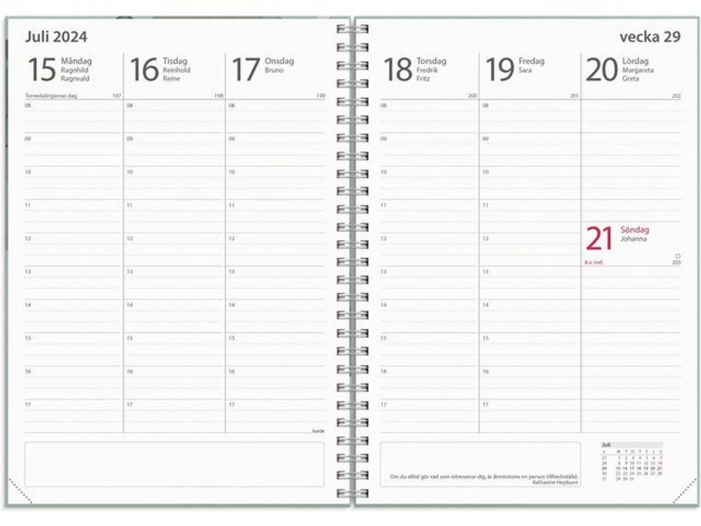 Kalendern har ett naturinspirerat motiv. Inlagan är en tydlig kalender med stående layout och timindelning 8-17, som hjälper dig att behålla strukturen genom hela läsåret. Kalendern har även en praktisk förvaringsficka och tänkvärda citat. - Format: A5. - Layout: Stående. Vecka/Uppslag. - Kalendarium: 2024-06-03 - 2025-08-31. - Omslag: Kartong med struktur. Spiralbunden. - Detaljer: Pappersficka. - Innehåll: Årsplaner, schema, provresultat. - Antal sidor: 176. - Miljöinformation: FSC®.