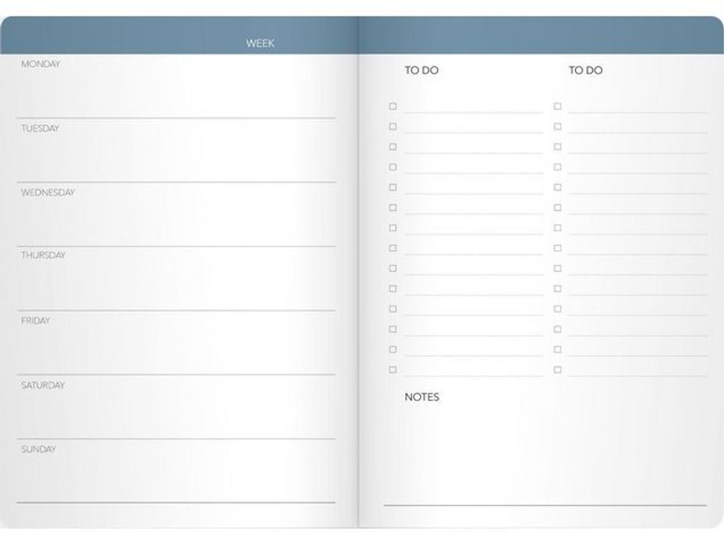 Inbunden, odaterad kalender i mjukt, mörkblått kartongomslag med silverprägling med vitt märkband och pappersficka bak. Smart planeringsverktyg med att-göra-listor för varje månad, vecka och nästkommande månad, plats för dagliga anteckningar, samt prickade sidor för egna kreationer. Engelsk inlaga. 90 g vitt papper, 128 vita blad (256 sidor). FSC®. Format: A5.