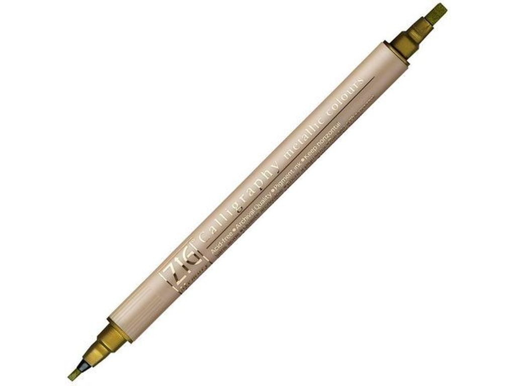 Kalligrafipenna ZIG Metallic MS-8400 guld med dubbla spetsar 2 och 3,5mm. Vattenbaserat pigmentbläck som står emot 'tidens tand' och är fotosäkert, syrafritt, arkivbeständigt, ljusäkta och vattenfast efter torkning. Xylen- och luktfritt. - Arkivbeständigt - Ljusäkta - Vattenfast efter torkning - Xylen- och luktfritt - Dubbla spetsar