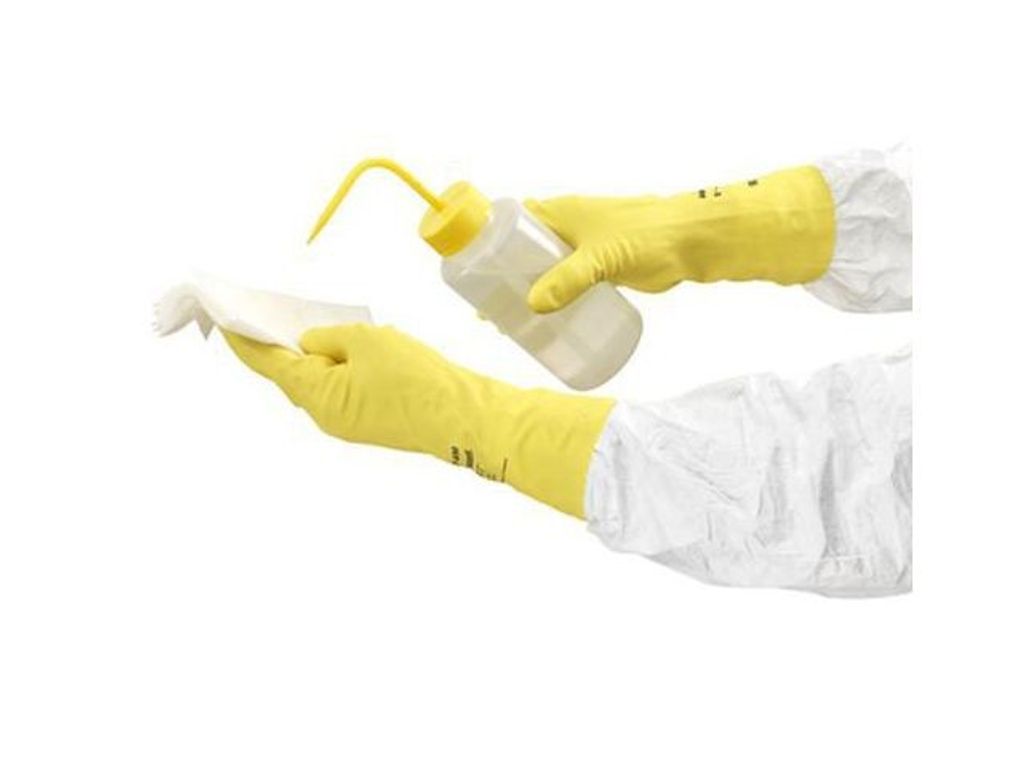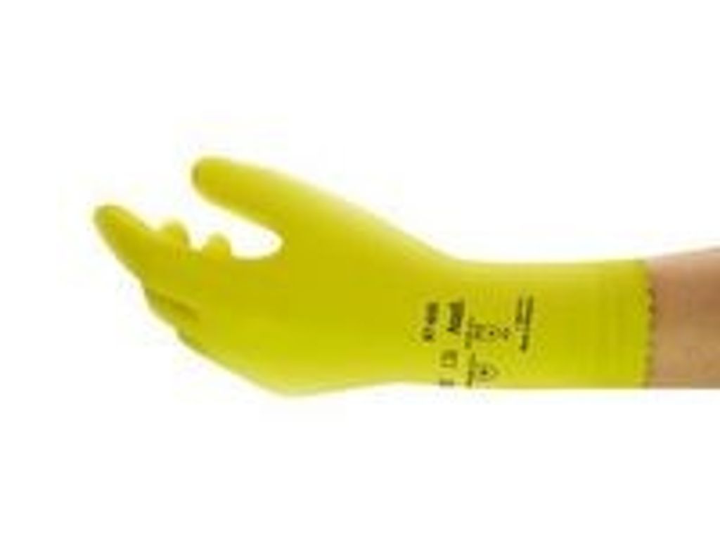 Handske ANSELL 87-650 är en bekväm kemikaliebeständig handske som därför gör den idealisk till rengöring och hantering av kemikalier. Denna handske av 100% naturgummi ger utmärkt fingerkänsla och överlägsen draghållfasthet. Handsken är mjuk och dess 100% rena bomullsvelourisering är bekväm och irriterar inte. Specialbehandlad för att minska risken för allergiska reaktioner. Rekommenderas för användning vid bl a kemiska processer och beredningar, fastighetsskötsel, lätta monteringsuppgifter och underhåll av anläggningar och maskiner. - CE-certifierad - Godkänd enligt: EN 374: 2003, EN 374-1: 2016, EN388: X010 (2003) - 1010 (2016), EN 421, EN 420:2003 + A1:2009:Kategori III - Klassificering: Kategori III - Material: Latex - Flockad: Ja - Pudrade: Ja - Tjocklek: 0,4 mm - Längd: 30,5 cm - AQL 0,65 - Färg: Gul - Storlek: S9