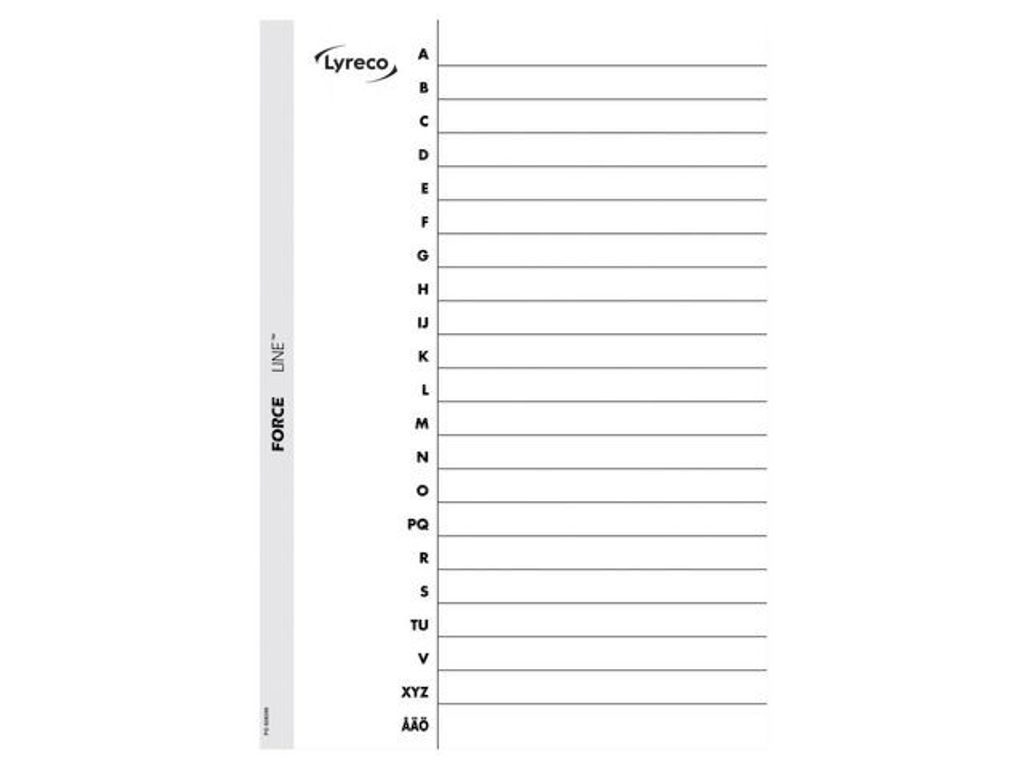 Universalhålat kartngregister med förstärkta hål. Alfabetiskt register (A-Ö) i A4-format. Bokstäverna finns tryckta på både försättsblad och registerblad. Försättsbladet har fält att skriva innehållet i. - Tillverkat av vit 160 g kartong. - 11 förstärkta hål med hålförstärkning av Force Line-typ. - Universalhålning - 160g