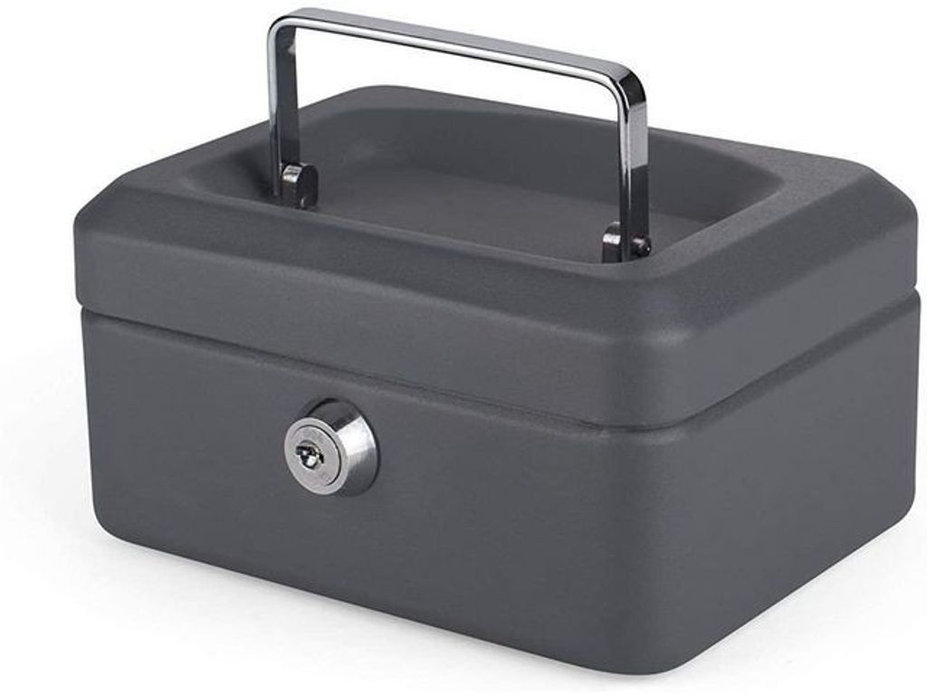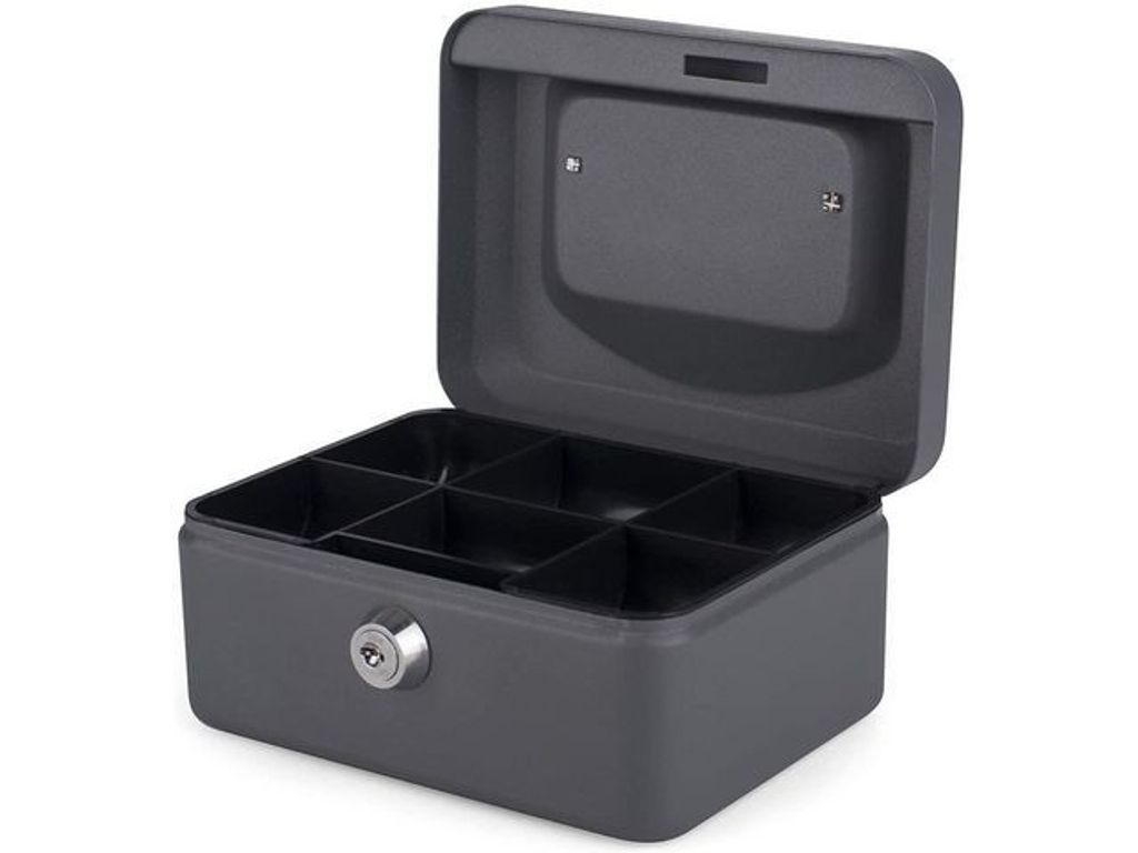 Beskrivning av Kassaskrin 115x150x80mm mörkgrå Säkert kassaskrin med 2 nycklar och myntlåda som är uttagbar. Förvara dina kontanter säkert i ett kassaskrin. - Mått: 160x203x90mm - Färg: Mörkgrå - 2 nycklar - Matt yta - 0,8mm stål