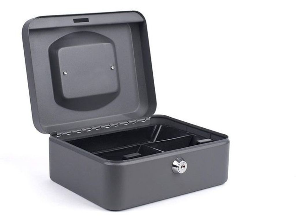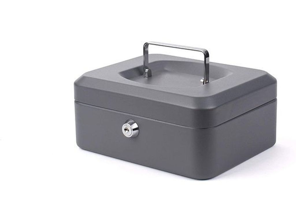 Beskrivning av Kassaskrin 160x200x90mm mörkgrå Säkert kassaskrin med 2 nycklar och myntlåda som är uttagbar. Förvara dina kontanter säkert i ett kassaskrin. - Mått: 160x200x90mm - Färg: Mörkgrå - 2 nycklar - Matt yta - 0,8mm stål -
