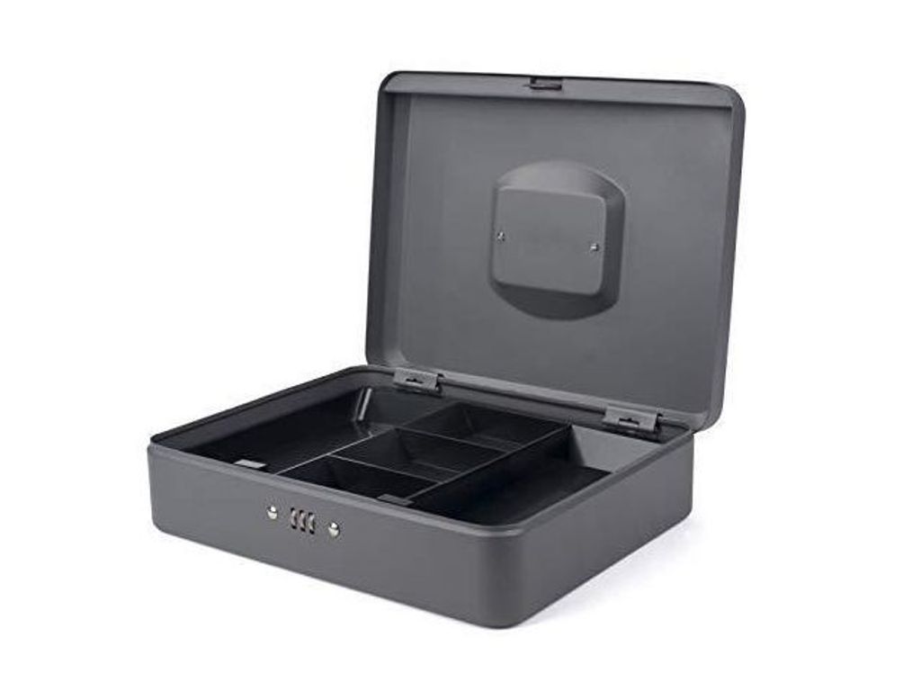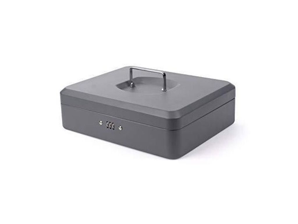 Beskrivning av Kassaskrin m. komb.lås 240x300x90mm mgrå Säkert kassaskrin med kombinationslås och myntlåda som är uttagbar. Förvara dina kontanter säkert i ett kassaskrin. - Mått: 240x300x90mm - Färg: Mörkgrå - Matt yta - 0,8mm stål