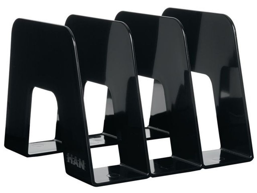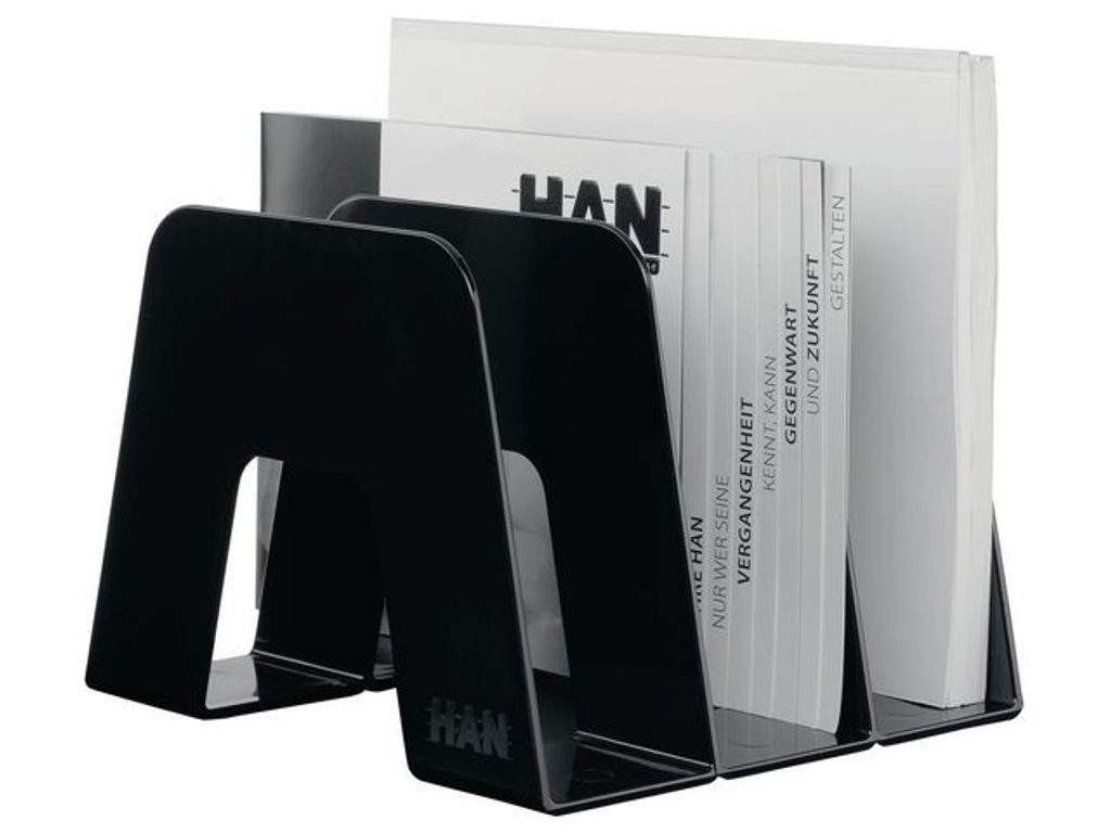 Praktiskt magasinställ för ett stort antal tidskrifter, broschyrer och broschyrer. Elegant design, högglansig yta och moderna tydliga linjer kompletterar bilden av ett designorienterat kontor. Idealisk för kontor och privat bruk. 3 fack med en bredd på 65 mm vardera. Halkfria gummimöbelskydd garanterar ett fast grepp - Yttre mått: (B x D x H): 209 x 224 x 163 mm. - Material: Högkvalitativ plast, polystyren - Färg: Svart. Tillverkad av återvunnet material