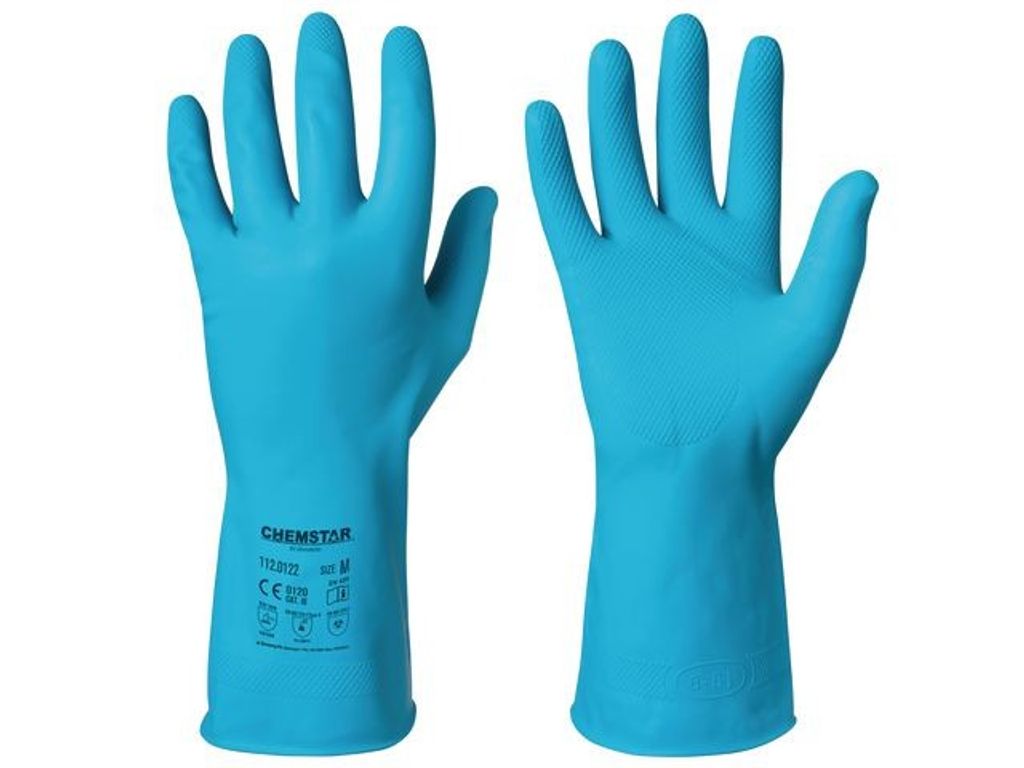 Slitstarka lite längre latexhandskar lämpliga för arbete inom livsmedelsindustri, laboratorier, städning, underhåll och montering i våta miljöer. Slitstarka, lite längre handskar som ger ett bra skydd för händerna och handlederna. Med ett räfflat mönster på handflatan och fingrarna vilket gör dem idealiska för användning i torra eller våta förhållanden. Med flossad insida. - CE-märkta - Godkända enligt: EN 388:2016+A1:2018, EN ISO 21420:2020, EN 374-1:2016 Type A KLMPST, EN 374-5:2016 - Livsmedelsgodkända - Material: naturlatex, bomullsflock - Flockad - Färg: blå - Längd: 30 cm - Storlek: Small