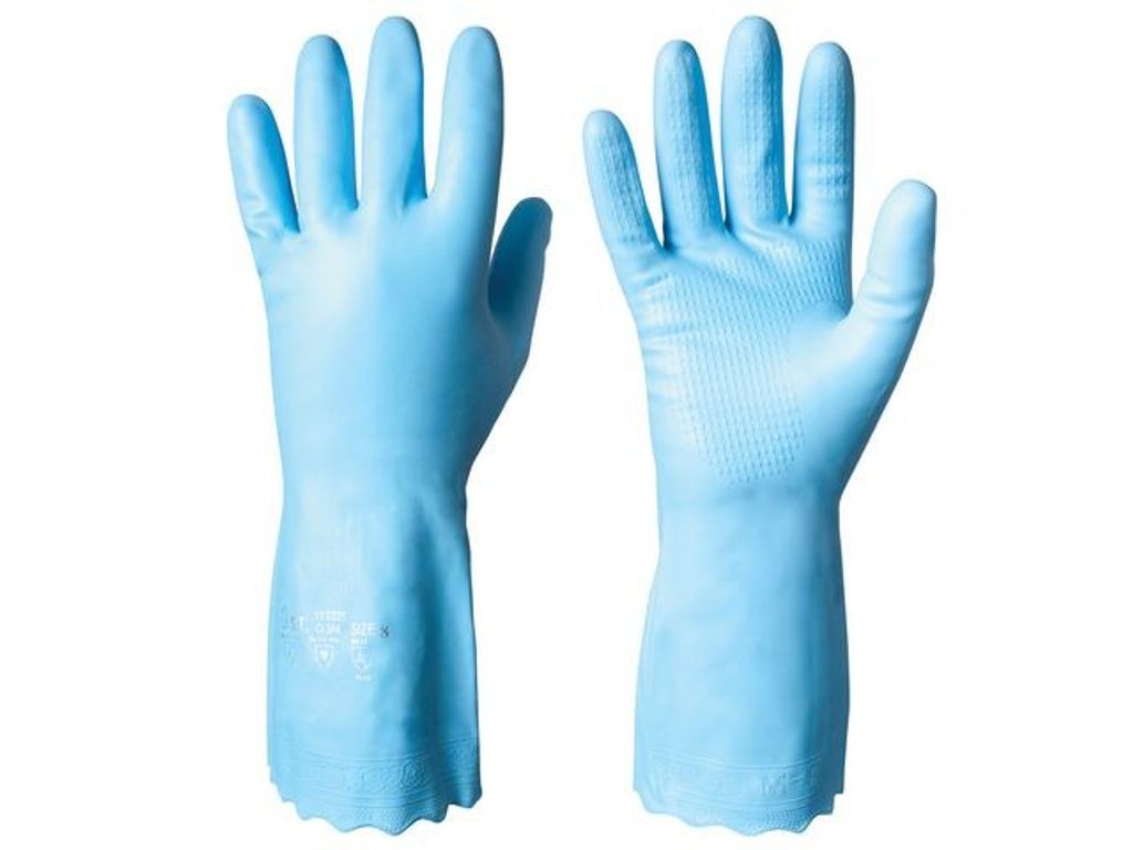 Kemikaliehandskar utan latex eller ftalater, lämpliga för våta arbeten och kemikaliehantering inom tillverkningsindustri, städning, sanering och underhåll. Vinylhandskar med goda isolerande egenskaper som skyddar händerna från hett vatten och kemikalier, inklusive blekmedel. Mönstrad greppyta och en flossad insida vilket gör dem bekväma att använda. lämpliga att använda hemma eller vid professionell rengöring. Innehåller varken latex, ftalater eller acceleratorer. Lämpliga för våta arbeten och kemikaliehantering (enligt test) inom tillverkningsindustri, städning, sanering och underhåll så som: Bilindustri & bilmek Fastighetsskötsel Laboratorie Detaljhandel - CE-märkta - Godkända enligt: EN 388:2016+A1:2018, EN ISO 21420:2020, EN 374-1:2016 Type B KPT, EN 374-5:2016 - Material: vinyl, velour - Skyddsklass: III - Färg: Blå - Storlek: 8 (medium)