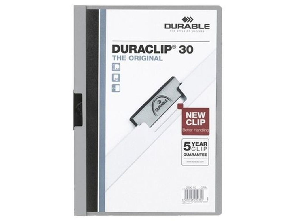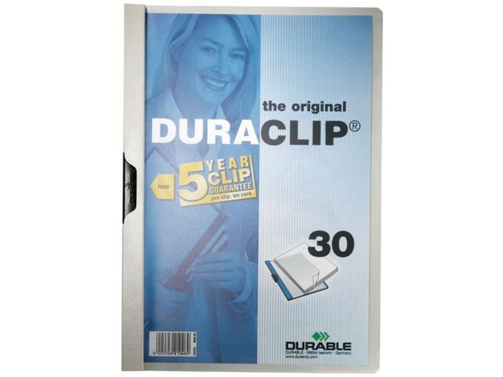 Klämmappen Durable Duraclip® är en högkvalitativ mapp i A4-format med en praktisk utdragbar stålklämma. Den är perfekt för rapporter, anteckningar eller beräkningar. Den här klämmappen rymmer upp till 30 ark och har transparent framsida och färgad baksida och rygg. Mapparna är tillverkade av PVC och har en stålklämma som underlättar organisering. Den här tåliga mappen har 5 års garanti och ett unikt klämsystem enkelt anpassar sig efter antalet ark. Dra helt enkelt ut klämman, sätt in dokumenten och skjut klämman på plats igen. Tillverkad av PVC. - Presentationsmapp i A4-format med stålklämma - Rymmer upp till 60 A4-ark - Tillverkad av PVC - Genomskinlig framsida - Unik fjädrad stålklämma för bättre organisering - 5 års garanti på klämman - Färg: Grå