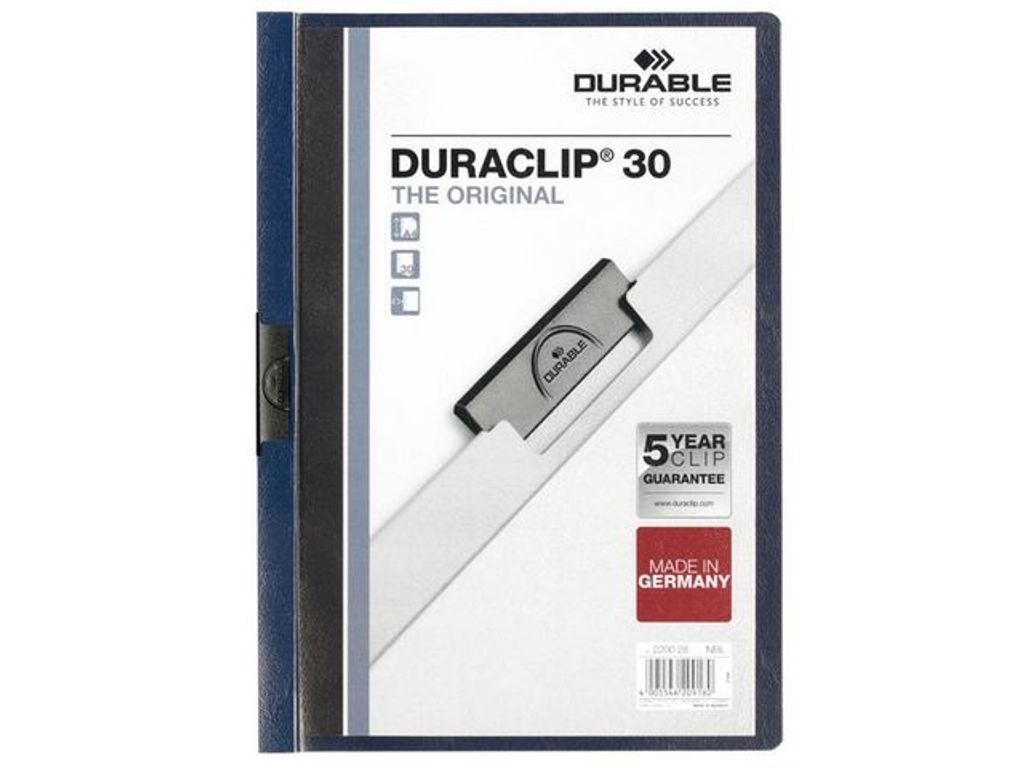 Durable Duraclip® är en högkvalitativ midnattsblå klämmapp i A4-format med en praktisk utdragbar klämma som är idealisk för rapporter, anteckningar eller beräkningar. Den här klämmappen rymmer upp till 30 ark och har transparent framsida och färgad baksida och rygg. Mappen har en stålklämma med 5 års garanti som gör mappen enklare att hantera. Har en utdragbar stålklämma Transparent framsida Idealisk för anteckningar, rapporter och offerter Praktisk för förvaring av dokument Tillverkad av PVC. - Kan användas tillsammans med Durable-produktkod(er): 809801