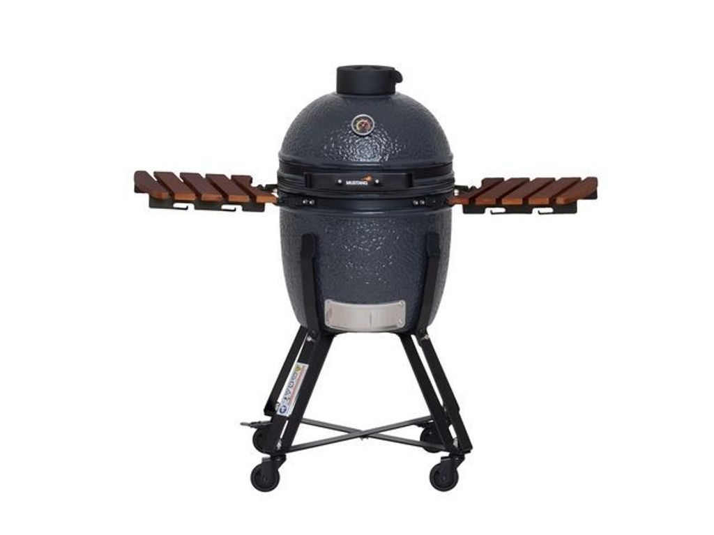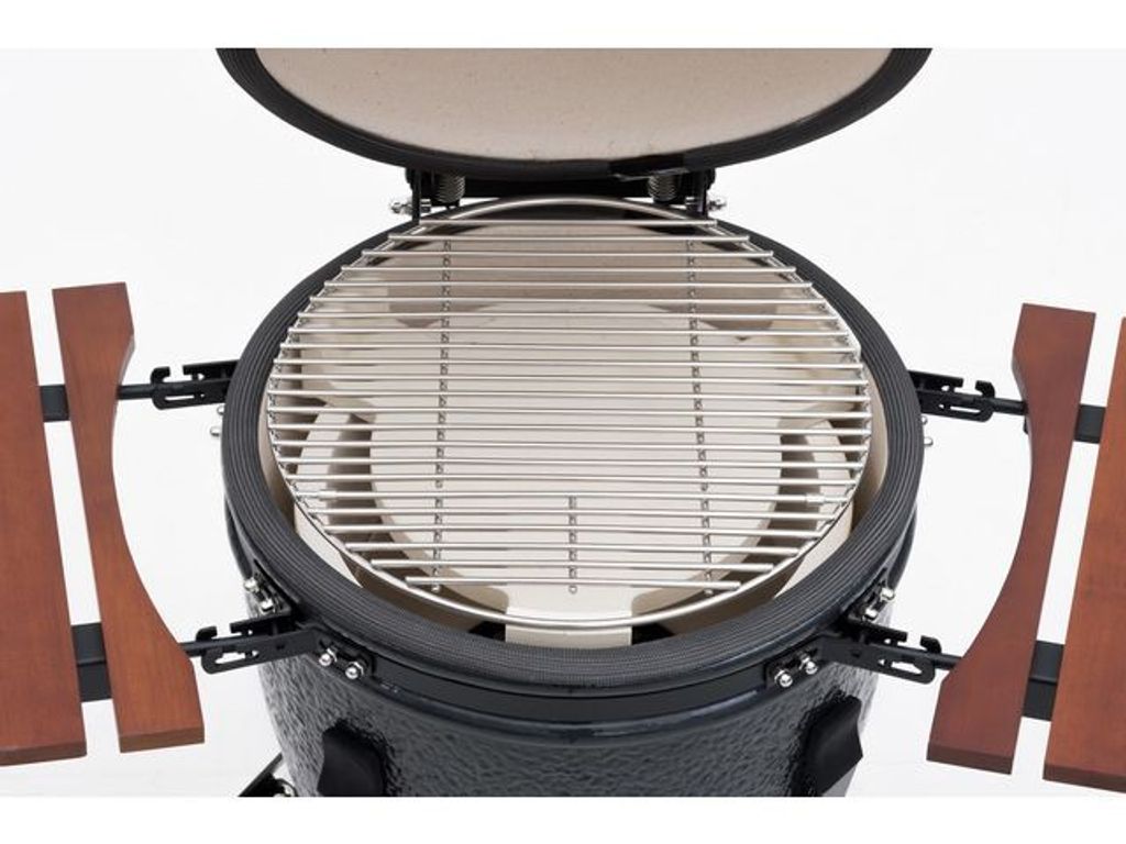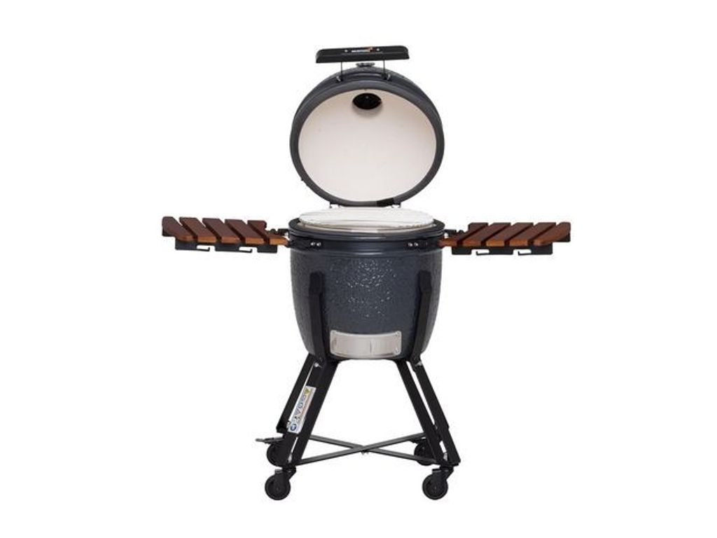 En keramisk och hållbar kolgrill för krävande förhållanden Kamado kolgrill M möjliggör grillning under lång tid vid låga temperaturer, eftersom den keramiska stommen håller värmen bättre. Keramisk mullitlera klarar värme på upp till 1000 grader. En ny huvudventil av gjutjärn möjliggör exakt reglering av ventilation. Nedtill finns en nedre ventil med ett säkerhetsnät som tillför luft till kolen. Grillgallret är 38 cm i diameter och tillverkad av 304 rostfritt stål. Kolgaller av gjutjärn. Vagnen är pulverlackerad och har fyra små låsbara hjul. Båda sidorna har vikbara och avtagbara sidobord av bambu. En keramisk värmefördelningsplåt med tre ben och en eldgaffel för askborttagning ingår. - Mått: 116 x 64 x 107 cm - Grillgaller: 38 cm, rostfritt stål - Färg: grå - Termometer: 1 - Luftreglerventil: 2 - Temperaturområde 82–399 °C - Skyddsöverdrag: Kamado M, säljs separat art 244015