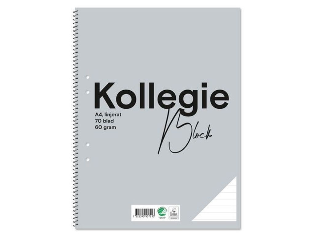 Kollegieblock med spiralbindning och linjerat papper. Kollegieblockets omslag, papper och stödplatta är hålade. Arken är Mikroperforerade på vänster sida för enkel avrivning. Vitt linjerat papper med en svart spiral längs vänster kant. Hörn på höger sida är fyrkantiga. Arken är kantstansade vid mikroperforeringen för att förenkla avrivning. - Format: A4 - Antal blad: 70st - Hålat - Linjebredd: 9mm - Papper: 60g - Stödplatta: grå kartong utan tryck 500g - Omslag: 170g - Storlek: 22 x 29,5cm - Svanen: Licensnummer 30410112 - EU Ecolabel: Licensnummer AT/053/047