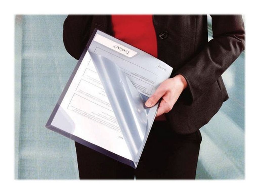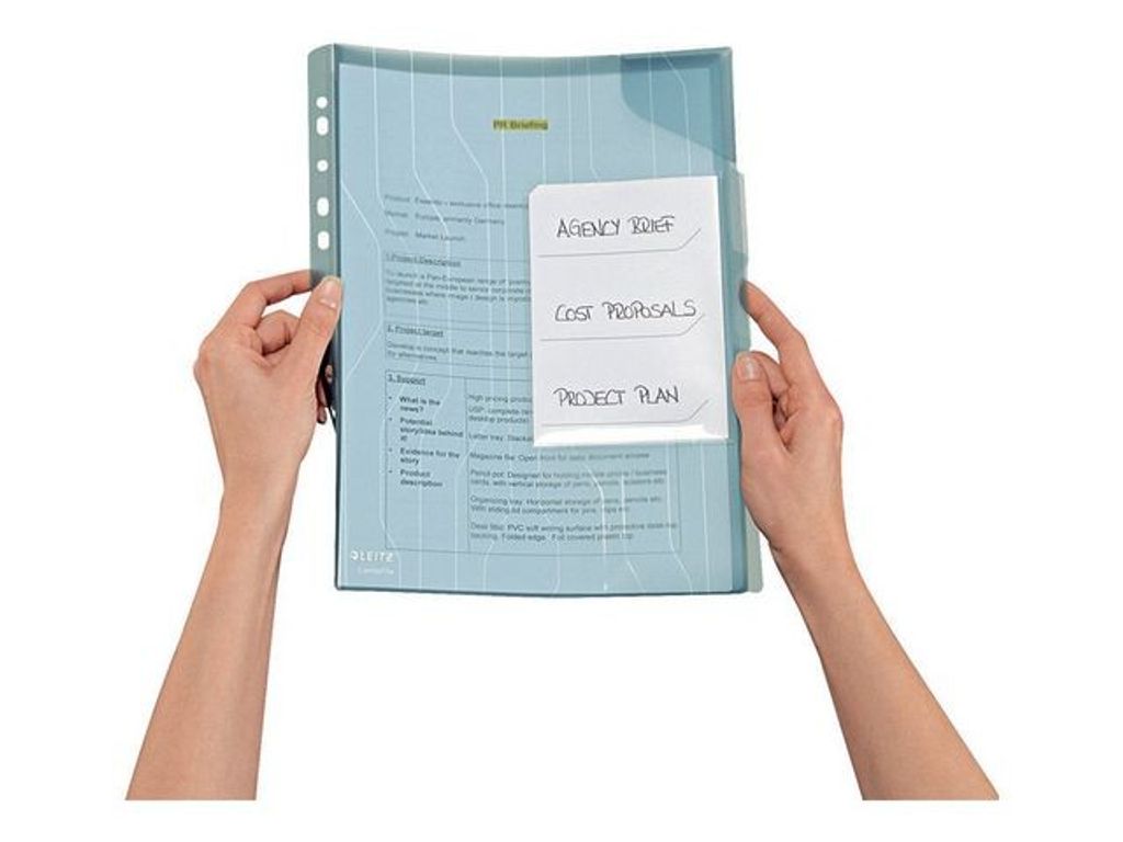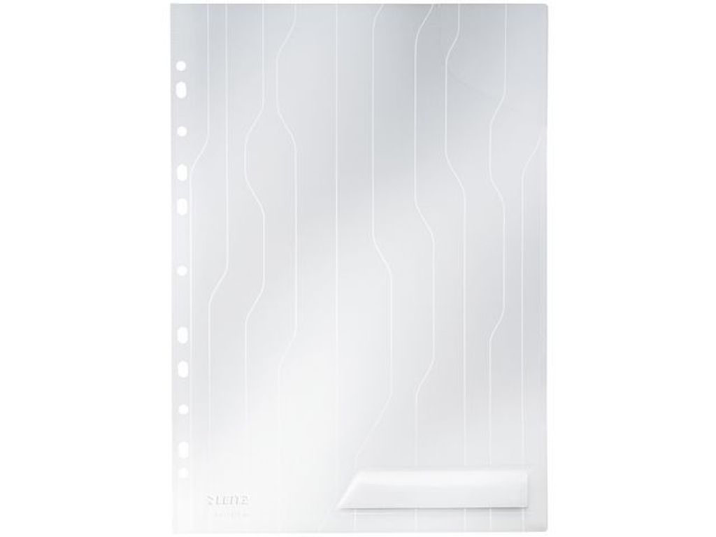 Håll dokumenten organiserade och skyddade med den här unika och stansade fickan i L-format med toppflik från Leitz. Den här stansade fickan från Leitz har en topp- och sidoöppning med flikförslutning, vilket håller dina dokument säkra och skyddade. Det här dokumentskyddet är tillverkat av högkvalitativ, hållbar och slitstark polypropylenfolie. Den är flexibel och perfekt för att staplas på skrivbordet eller ha med sig när man reser. Dokumentskyddet döljer konfidentiella dokument tack vare dess präglade yta. Dessutom har den här mappen ett märkningssystem som gör att du enkelt kan organisera dina dokument. Den stansade fickan i A4-format från Leitz har hål för förvaring i en mapp eller ringpärm och den rymmer upp till 40 ark. - Combi jämnskuren mapp/stansad ficka - Topp- och sidoöppning med förslutningsflik - Med märkningsremsor - Format som stöds: A4 - Hål: 11 - Material: Polypropylen - Tjocklek: 200 mikrometer - Färg: Vit