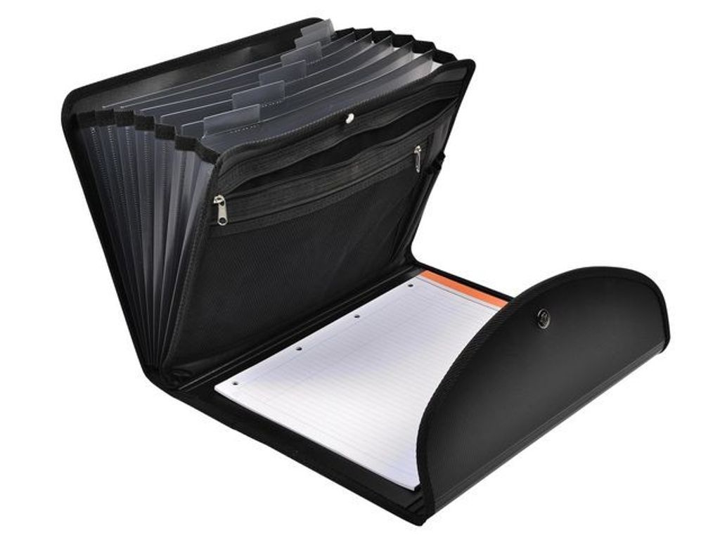 Med sorteringsmappen Exacompta Exafolio Exactive® kan du bära med dig dina dokument och allt du behöver för att göra anteckningar på ett organiserat sätt. Sorteringsmappen Exacompta Exactive® har en utdragbar mapp med sex fack som rymmer upp till 200 ark med A4-papper. Flikavdelare med etiketter gör arkiveringen av dina viktiga dokument i kategorier smidig. Dessutom levereras mappen med två fickor med blixtlås, flera pennhållare och ett anteckningsblock som kan bytas ut mot valfri typ av block eller skrivbok, till exempel ett anteckningsblock med spiralrygg. Den här sorteringsmappen är lätt och robust och tillverkad av innovativ 80 % återvunnen polypropylen. Den är en idealisk lösning för när du vill bära med dig och skydda dina dokument och allt du behöver för att göra anteckningar. - Innehåller en utdragbar mapp med sex fack - Lagringskapacitet: 200 ark med A4-papper - Flikavdelare med etiketter för kategorisering - Utbytbart skrivblock för anteckningar - Fickor med blixtlås och pennhållare - Lätt och robust - Material: Innovativ 80% återvunnen polypropylen - Mått: 255 x 335 mm - Färg: Svart