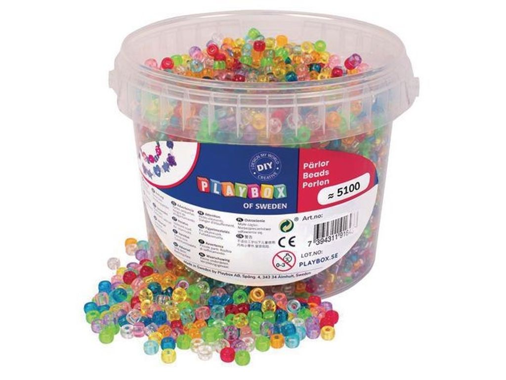 Färgglada kongopärlor för allt pyssel! Praktisk hink full av färgglada kongopärlor i mindre storlek i transparenta kulörer. Passar perfekt till att göra fina dekorationer, armband eller halsband och pärlornas stora hål gör dem lätta att trä. - Antal: Ca 5000/FP - Storlek: Ø 6 mm - Vikt: ca 450 g - Färger: Blå, lila, röd, cerise, rosa, orange, gul och grön